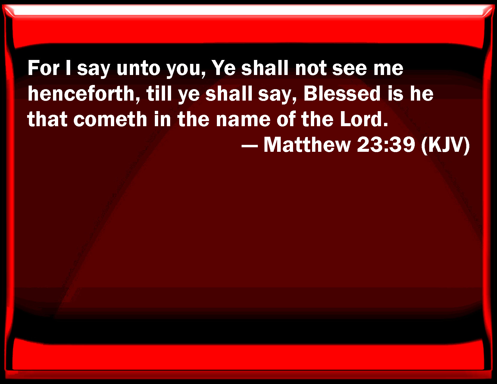 Bible Verse Slide Matthew 23:39 For I say to you, You shall not see me from now on, till you shall say, Blessed is he that comes in the name of the Lord. KJV: For I say unto you, Ye shall not see me henceforth, till ye shall say, Blessed is he that cometh in the name of the Lord. DRB: For I say to you, you shall not see me henceforth till you say: Blessed is he that cometh in the name of the Lord. DBT: for I say unto you, Ye shall in no wise see me henceforth until ye say, Blessed be he that comes in the name of the Lord. ERV: For I say unto you, Ye shall not see me henceforth, till ye shall say, Blessed is he that cometh in the name of the Lord. WBT: For I say to you, Ye shall not see me henceforth, till ye shall say, Blessed is he that cometh in the name of the Lord. WEB: For I tell you, you will not see me from now on, until you say, 'Blessed is he who comes in the name of the Lord!'" YLT: for I say to you, ye may not see me henceforth, till ye may say, Blessed is he who is coming in the name of the Lord.'Links Matthew 23:39 NIV • Matthew 23:39 NLT • Matthew 23:39 ESV • Matthew 23:39 NASB • Matthew 23:39 KJV • Matthew 23:39 Interlinear • Matthew 23:39 Commentaries • Matthew 23:39 Parallel Texts • Matthew 23:39 Bible Apps • Matthew 23:39 Parallel • Bible Hub |