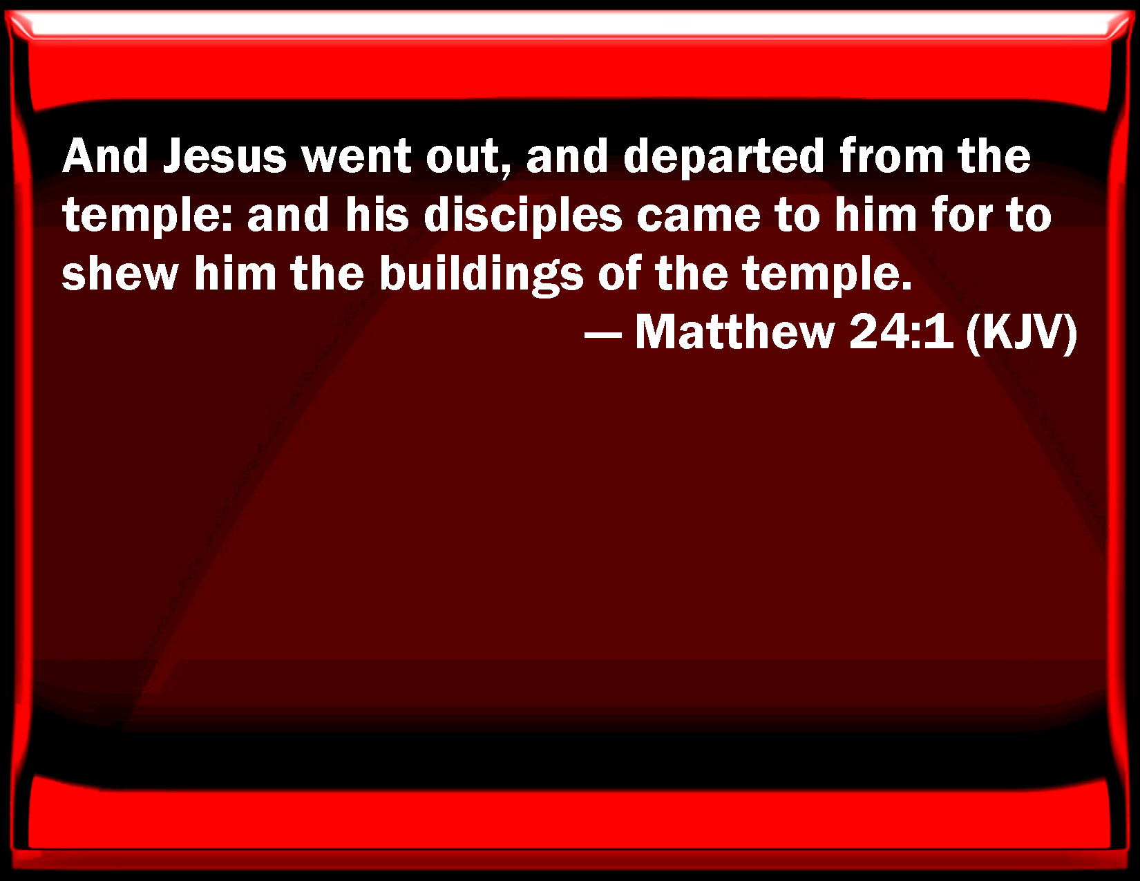 Bible Verse Slide Matthew 24:1 And Jesus went out, and departed from the temple: and his disciples came to him for to show him the buildings of the temple. KJV: And Jesus went out, and departed from the temple: and his disciples came to him for to shew him the buildings of the temple. DRB: AND Jesus being come out of the temple, went away. And his disciples came to shew him the buildings of the temple. DBT: And Jesus went forth and went away from the temple, and his disciples came to him to point out to him the buildings of the temple. ERV: And Jesus went out from the temple, and was going on his way; and his disciples came to him to shew him the buildings of the temple. WBT: And Jesus went out, and departed from the temple: and his disciples came to him to show him the buildings of the temple. WEB: Jesus went out from the temple, and was going on his way. His disciples came to him to show him the buildings of the temple. YLT: And having gone forth, Jesus departed from the temple, and his disciples came near to show him the buildings of the temple,Links Matthew 24:1 NIV • Matthew 24:1 NLT • Matthew 24:1 ESV • Matthew 24:1 NASB • Matthew 24:1 KJV • Matthew 24:1 Interlinear • Matthew 24:1 Commentaries • Matthew 24:1 Parallel Texts • Matthew 24:1 Bible Apps • Matthew 24:1 Parallel • Bible Hub |