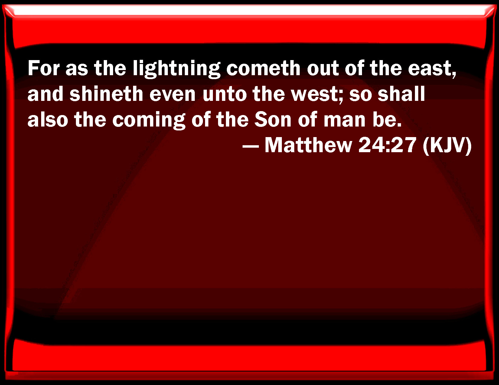 Bible Verse Slide Matthew 24:27 For as the lightning comes out of the east, and shines even to the west; so shall also the coming of the Son of man be. KJV: For as the lightning cometh out of the east, and shineth even unto the west; so shall also the coming of the Son of man be. DRB: For as lightning cometh out of the east, and appeareth even into the west: so shall the coming of the Son of man be. DBT: For as the lightning goes forth from the east and shines to the west, so shall be the coming of the Son of man. ERV: For as the lightning cometh forth from the east, and is seen even unto the west; so shall be the coming of the Son of man. WBT: For as the lightning cometh out of the east, and shineth even to the west; so shall also the coming of the Son of man be. WEB: For as the lightning flashes from the east, and is seen even to the west, so will be the coming of the Son of Man. YLT: for as the lightning doth come forth from the east, and doth appear unto the west, so shall be also the presence of the Son of Man;Links Matthew 24:27 NIV • Matthew 24:27 NLT • Matthew 24:27 ESV • Matthew 24:27 NASB • Matthew 24:27 KJV • Matthew 24:27 Interlinear • Matthew 24:27 Commentaries • Matthew 24:27 Parallel Texts • Matthew 24:27 Bible Apps • Matthew 24:27 Parallel • Bible Hub |