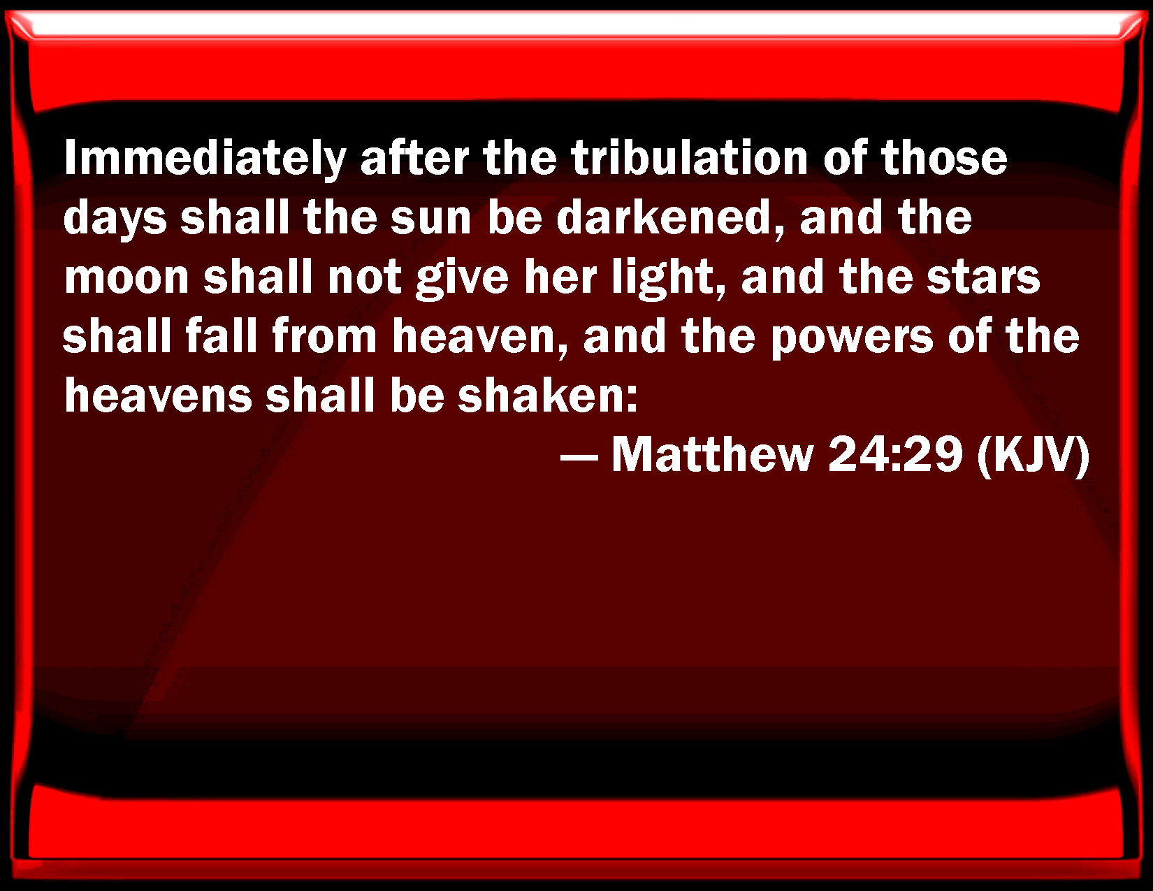 Bible Verse Slide Matthew 24:29 Immediately after the tribulation of those days shall the sun be darkened, and the moon shall not give her light, and the stars shall fall from heaven, and the powers of the heavens shall be shaken: KJV: Immediately after the tribulation of those days shall the sun be darkened, and the moon shall not give her light, and the stars shall fall from heaven, and the powers of the heavens shall be shaken: DRB: And immediately after the tribulation of those days, the sun shall be darkened and the moon shall not give her light, and the stars shall fall from heaven, and the powers of heaven shall be moved: DBT: But immediately after the tribulation of those days the sun shall be darkened, and the moon not give her light, and the stars shall fall from heaven, and the powers of the heavens shall be shaken. ERV: But immediately, after the tribulation of those days, the sun shall be darkened, and the moon shall not give her light, and the stars shall fall from heaven, and the powers of the heavens shall be shaken: WBT: Immediately after the tribulation of those days, shall the sun be darkened, and the moon shall not give her light, and the stars shall fall from heaven, and the powers of the heavens shall be shaken: WEB: But immediately after the oppression of those days, the sun will be darkened, the moon will not give its light, the stars will fall from the sky, and the powers of the heavens will be shaken; YLT: 'And immediately after the tribulation of those days, the sun shall be darkened, and the moon shall not give her light, and the stars shall fall from the heaven, and the powers of the heavens shall be shaken;Links Matthew 24:29 NIV • Matthew 24:29 NLT • Matthew 24:29 ESV • Matthew 24:29 NASB • Matthew 24:29 KJV • Matthew 24:29 Interlinear • Matthew 24:29 Commentaries • Matthew 24:29 Parallel Texts • Matthew 24:29 Bible Apps • Matthew 24:29 Parallel • Bible Hub |