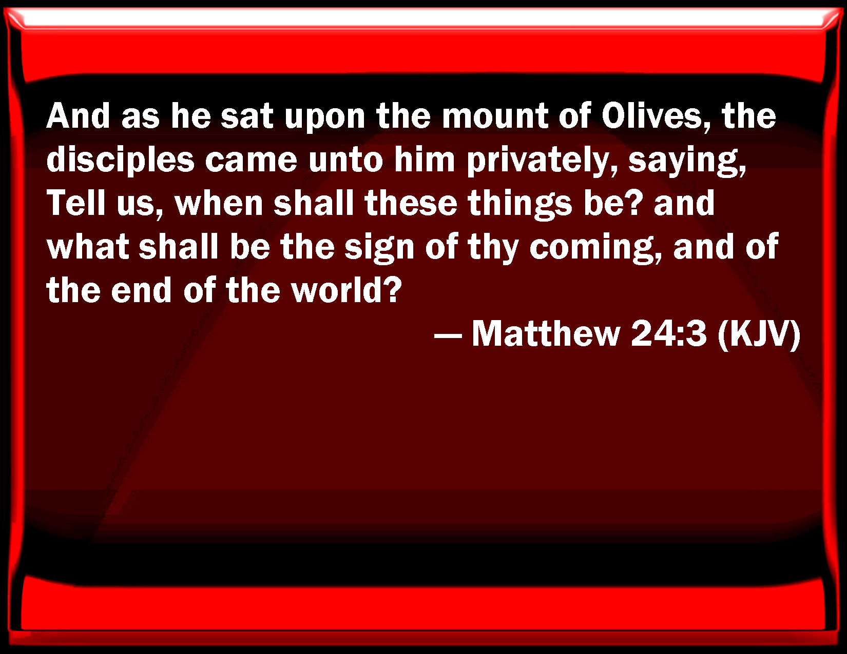 Bible Verse Slide Matthew 24:3 And as he sat on the mount of Olives, the disciples came to him privately, saying, Tell us, when shall these things be? and what shall be the sign of your coming, and of the end of the world? KJV: And as he sat upon the mount of Olives, the disciples came unto him privately, saying, Tell us, when shall these things be? and what shall be the sign of thy coming, and of the end of the world? DRB: And when he was sitting on mount Olivet, the disciples came to him privately, saying: Tell us when shall these things be? and what shall be the sign of thy coming, and of the consummation of the world? DBT: And as he was sitting upon the mount of Olives the disciples came to him privately, saying, Tell us, when shall these things be, and what is the sign of thy coming and the completion of the age? ERV: And as he sat on the mount of Olives, the disciples came unto him privately, saying, Tell us, when shall these things be? and what shall be the sign of thy coming, and of the end of the world? WBT: And as he sat upon the mount of Olives, the disciples came to him privately, saying, Tell us, when will these things be? and what will be the sign of thy coming, and of the end of the world? WEB: As he sat on the Mount of Olives, the disciples came to him privately, saying, "Tell us, when will these things be? What is the sign of your coming, and of the end of the age?" YLT: And when he is sitting on the mount of the Olives, the disciples came near to him by himself, saying, 'Tell us, when shall these be? and what is the sign of thy presence, and of the full end of the age?'Links Matthew 24:3 NIV • Matthew 24:3 NLT • Matthew 24:3 ESV • Matthew 24:3 NASB • Matthew 24:3 KJV • Matthew 24:3 Interlinear • Matthew 24:3 Commentaries • Matthew 24:3 Parallel Texts • Matthew 24:3 Bible Apps • Matthew 24:3 Parallel • Bible Hub |