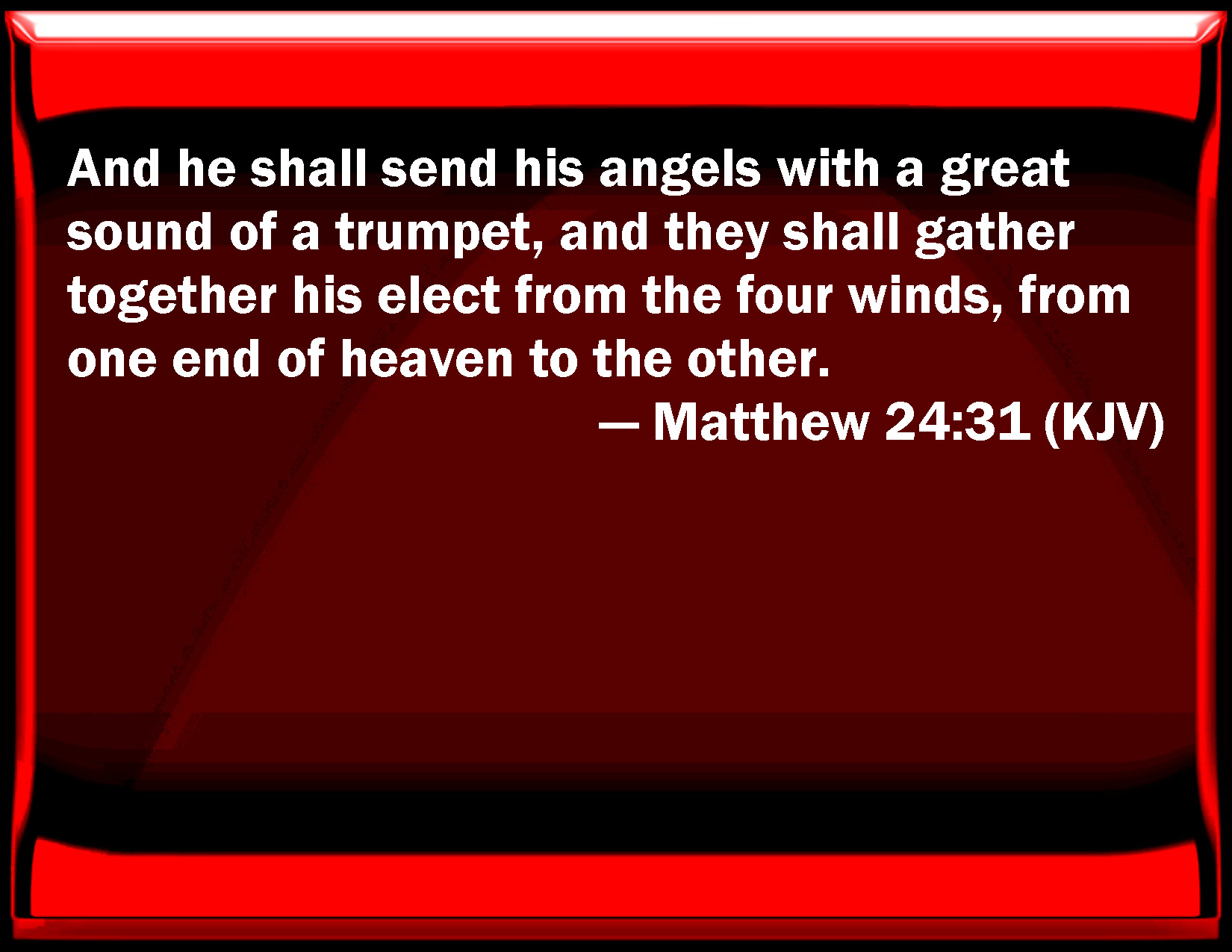 Bible Verse Slide Matthew 24:31 And he shall send his angels with a great sound of a trumpet, and they shall gather together his elect from the four winds, from one end of heaven to the other. KJV: And he shall send his angels with a great sound of a trumpet, and they shall gather together his elect from the four winds, from one end of heaven to the other. DRB: And he shall send his angels with a trumpet, and a great voice: and they shall gather together his elect from the four winds, from the farthest parts of the heavens to the utmost bounds of them. DBT: And he shall send his angels with a great sound of trumpet, and they shall gather together his elect from the four winds, from the one extremity of the heavens to the other extremity of them. ERV: And he shall send forth his angels with a great sound of a trumpet, and they shall gather together his elect from the four winds, from one end of heaven to the other. WBT: And he will send his angels with a great sound of a trumpet, and they will gather his elect from the four winds, from one end of heaven to the other. WEB: He will send out his angels with a great sound of a trumpet, and they will gather together his chosen ones from the four winds, from one end of the sky to the other. YLT: and he shall send his messengers with a great sound of a trumpet, and they shall gather together his chosen from the four winds, from the ends of the heavens unto the ends thereof.Links Matthew 24:31 NIV • Matthew 24:31 NLT • Matthew 24:31 ESV • Matthew 24:31 NASB • Matthew 24:31 KJV • Matthew 24:31 Interlinear • Matthew 24:31 Commentaries • Matthew 24:31 Parallel Texts • Matthew 24:31 Bible Apps • Matthew 24:31 Parallel • Bible Hub |