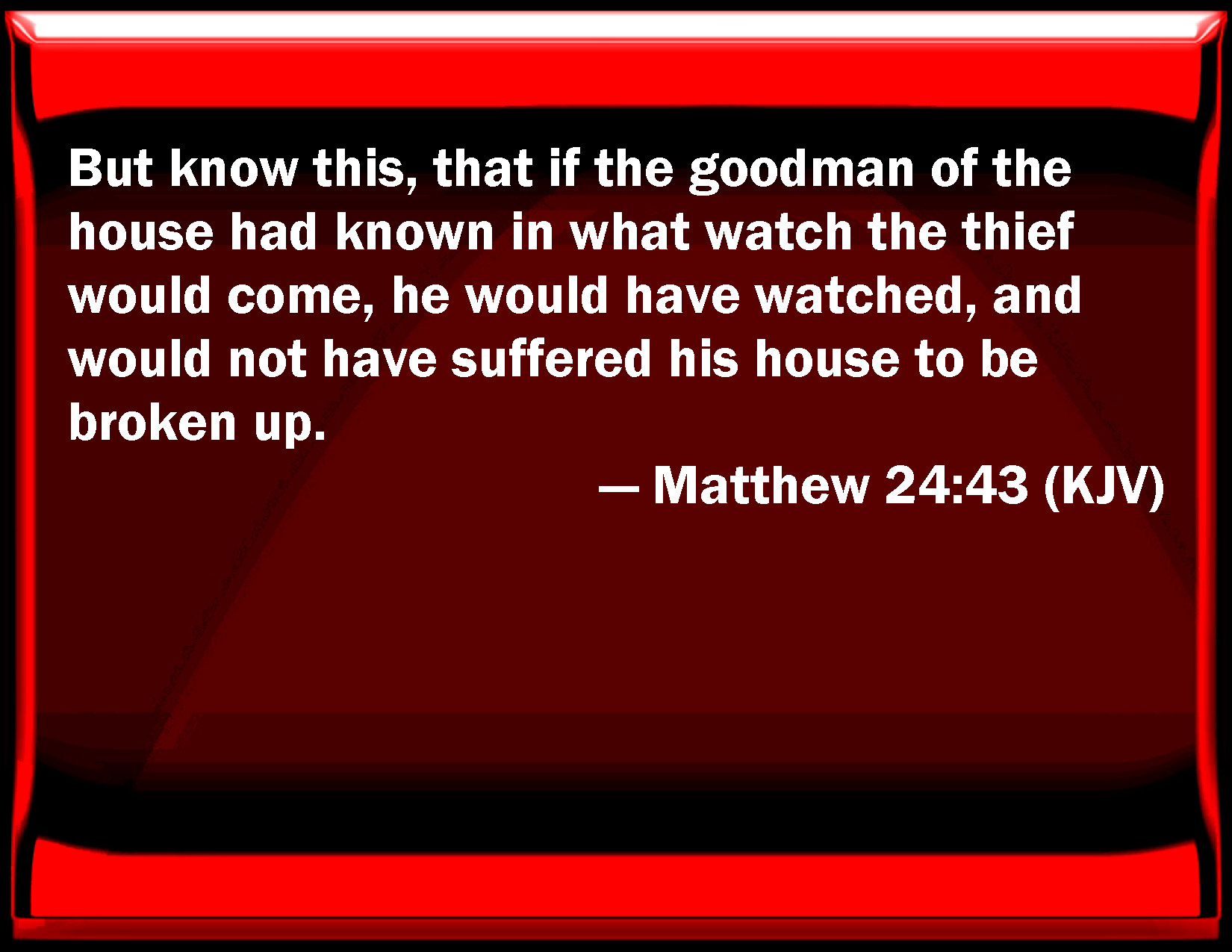 Bible Verse Slide Matthew 24:43 But know this, that if the manager of the house had known in what watch the thief would come, he would have watched, and would not have suffered his house to be broken up. KJV: But know this, that if the goodman of the house had known in what watch the thief would come, he would have watched, and would not have suffered his house to be broken up. DRB: But know this ye, that if the goodman of the house knew at what hour the thief would come, he would certainly watch, and would not suffer his house to be broken open. DBT: But know this, that if the master of the house had known in what watch the thief was coming, he would have watched and not have suffered his house to be dug through into. ERV: But know this, that if the master of the house had known in what watch the thief was coming, he would have watched, and would not have suffered his house to be broken through. WBT: But know this, that if the master of the house knew in what watch the thief would come, he would watch, and would not suffer his house to be broken up. WEB: But know this, that if the master of the house had known in what watch of the night the thief was coming, he would have watched, and would not have allowed his house to be broken into. YLT: and this know, that if the master of the house had known in what watch the thief doth come, he had watched, and not suffered his house to be broken through;Links Matthew 24:43 NIV • Matthew 24:43 NLT • Matthew 24:43 ESV • Matthew 24:43 NASB • Matthew 24:43 KJV • Matthew 24:43 Interlinear • Matthew 24:43 Commentaries • Matthew 24:43 Parallel Texts • Matthew 24:43 Bible Apps • Matthew 24:43 Parallel • Bible Hub |
