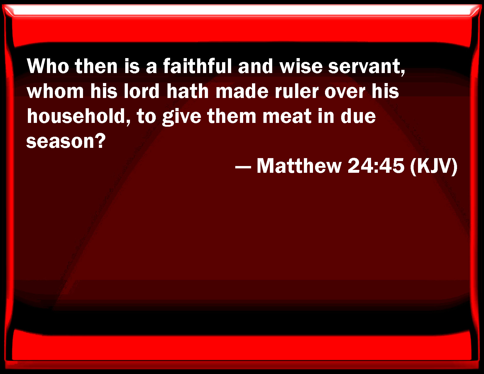 Bible Verse Slide Matthew 24:45 Who then is a faithful and wise servant, whom his lord has made ruler over his household, to give them meat in due season? KJV: Who then is a faithful and wise servant, whom his lord hath made ruler over his household, to give them meat in due season? DRB: Who, thinkest thou, is a faithful and wise servant, whom his lord hath appointed over his family, to give them meat in season. DBT: Who then is the faithful and prudent bondman whom his lord has set over his household, to give them food in season? ERV: Who then is the faithful and wise servant, whom his lord hath set over his household, to give them their food in due season? WBT: Who then is a faithful and wise servant, whom his Lord hath made ruler over his household, to give them food in due season? WEB: "Who then is the faithful and wise servant, whom his lord has set over his household, to give them their food in due season? YLT: 'Who, then, is the servant, faithful and wise, whom his lord did set over his household, to give them the nourishment in season?Links Matthew 24:45 NIV • Matthew 24:45 NLT • Matthew 24:45 ESV • Matthew 24:45 NASB • Matthew 24:45 KJV • Matthew 24:45 Interlinear • Matthew 24:45 Commentaries • Matthew 24:45 Parallel Texts • Matthew 24:45 Bible Apps • Matthew 24:45 Parallel • Bible Hub |
