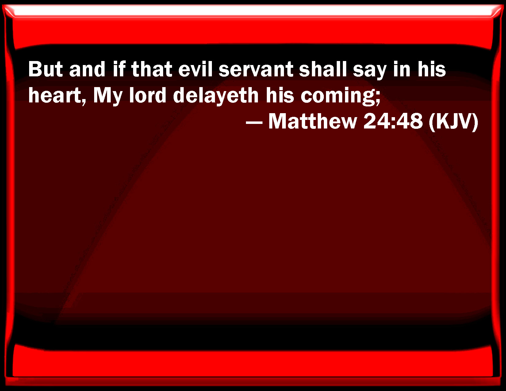 Bible Verse Slide Matthew 24:48 But and if that evil servant shall say in his heart, My lord delays his coming; KJV: But and if that evil servant shall say in his heart, My lord delayeth his coming; DRB: But if that evil servant shall say in his heart: My lord is long a coming: DBT: But if that evil bondman should say in his heart, My lord delays to come, ERV: But if that evil servant shall say in his heart, My lord tarrieth; WBT: But if that evil servant shall say in his heart, My Lord delayeth his coming; WEB: But if that evil servant should say in his heart, 'My lord is delaying his coming,' YLT: 'And, if that evil servant may say in his heart, My Lord doth delay to come,Links Matthew 24:48 NIV • Matthew 24:48 NLT • Matthew 24:48 ESV • Matthew 24:48 NASB • Matthew 24:48 KJV • Matthew 24:48 Interlinear • Matthew 24:48 Commentaries • Matthew 24:48 Parallel Texts • Matthew 24:48 Bible Apps • Matthew 24:48 Parallel • Bible Hub |
