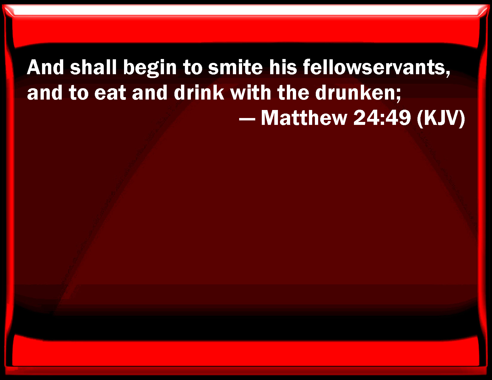 Bible Verse Slide Matthew 24:49 And shall begin to smite his fellow servants, and to eat and drink with the drunken; KJV: And shall begin to smite his fellowservants, and to eat and drink with the drunken; DRB: And shall begin to strike his fellow servants, and shall eat and drink with drunkards: DBT: and begin to beat his fellow-bondmen, and eat and drink with the drunken; ERV: and shall begin to beat his fellow-servants, and shall eat and drink with the drunken; WBT: And shall begin to beat his fellow-servants, and to eat and drink with the drunken; WEB: and begins to beat his fellow servants, and eat and drink with the drunkards, YLT: and may begin to beat the fellow-servants, and to eat and to drink with the drunken,Links Matthew 24:49 NIV • Matthew 24:49 NLT • Matthew 24:49 ESV • Matthew 24:49 NASB • Matthew 24:49 KJV • Matthew 24:49 Interlinear • Matthew 24:49 Commentaries • Matthew 24:49 Parallel Texts • Matthew 24:49 Bible Apps • Matthew 24:49 Parallel • Bible Hub |