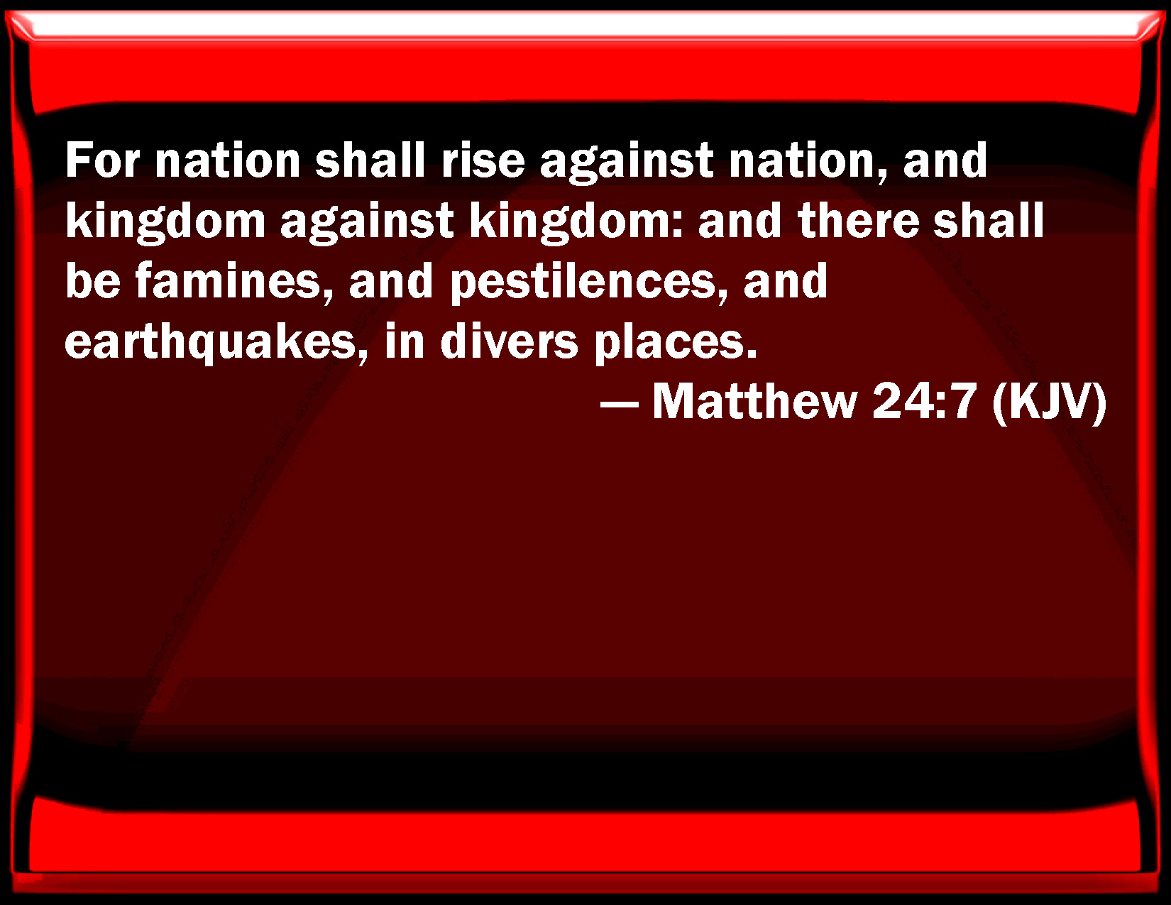 Bible Verse Slide Matthew 24:7 For nation shall rise against nation, and kingdom against kingdom: and there shall be famines, and pestilences, and earthquakes, in divers places. KJV: For nation shall rise against nation, and kingdom against kingdom: and there shall be famines, and pestilences, and earthquakes, in divers places. DRB: For nation shall rise against nation, and kingdom against kingdom; and there shall be pestilences, and famines, and earthquakes in places: DBT: For nation shall rise up against nation, and kingdom against kingdom; and there shall be famines and pestilences, and earthquakes in divers places. ERV: For nation shall rise against nation, and kingdom against kingdom: and there shall be famines and earthquakes in divers places. WBT: For nation will rise against nation, and kingdom against kingdom: and there will be famines, and pestilences, and earthquakes in divers places. WEB: For nation will rise against nation, and kingdom against kingdom; and there will be famines, plagues, and earthquakes in various places. YLT: 'For nation shall rise against nation, and kingdom against kingdom, and there shall be famines, and pestilences, and earthquakes, in divers places;Links Matthew 24:7 NIV • Matthew 24:7 NLT • Matthew 24:7 ESV • Matthew 24:7 NASB • Matthew 24:7 KJV • Matthew 24:7 Interlinear • Matthew 24:7 Commentaries • Matthew 24:7 Parallel Texts • Matthew 24:7 Bible Apps • Matthew 24:7 Parallel • Bible Hub |