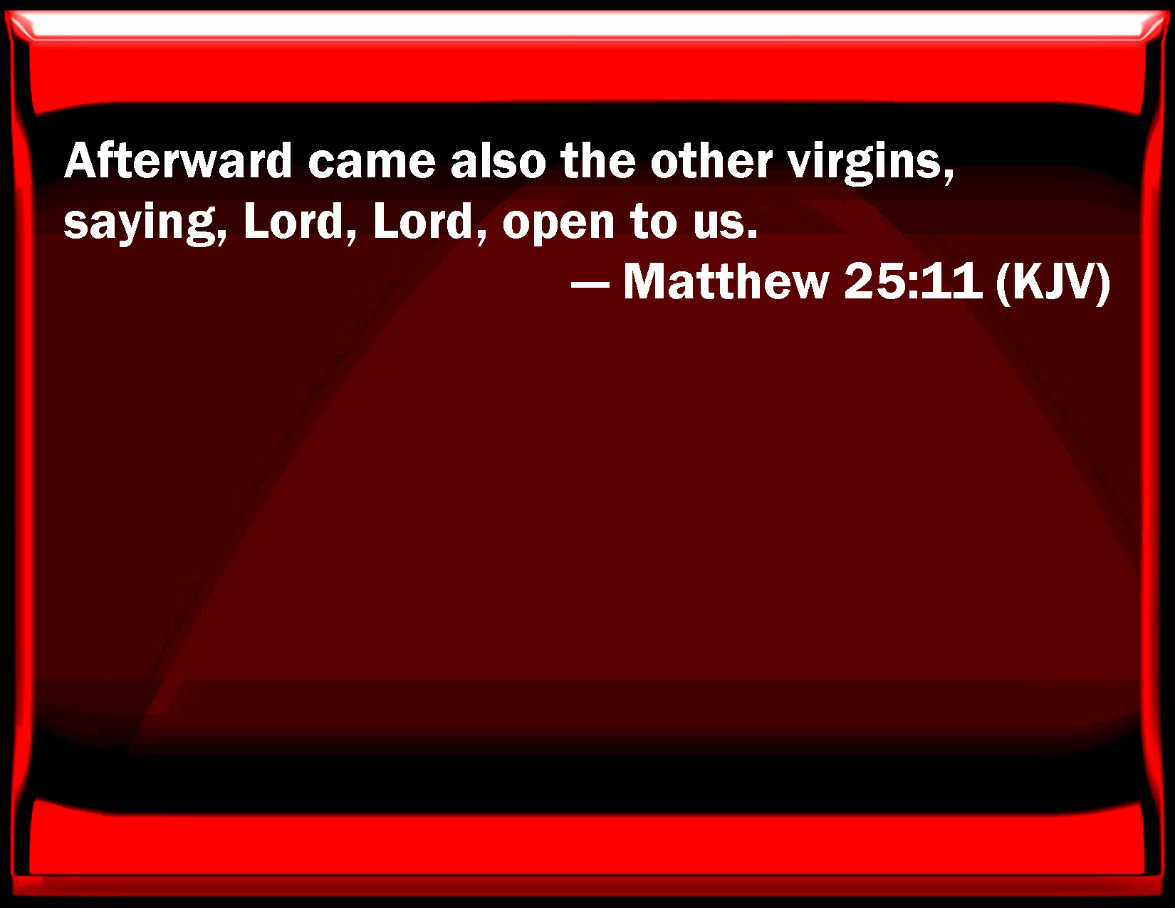 Bible Verse Slide Matthew 25:11 Afterward came also the other virgins, saying, Lord, Lord, open to us. KJV: Afterward came also the other virgins, saying, Lord, Lord, open to us. DRB: But at last come also the other virgins, saying: Lord, Lord, open to us. DBT: Afterwards come also the rest of the virgins, saying, Lord, Lord, open to us; ERV: Afterward come also the other virgins, saying, Lord, Lord, open to us. WBT: Afterward came also the other virgins, saying, Lord, Lord, open to us. WEB: Afterward the other virgins also came, saying, 'Lord, Lord, open to us.' YLT: and afterwards come also do the rest of the virgins, saying, Sir, sir, open to us;Links Matthew 25:11 NIV • Matthew 25:11 NLT • Matthew 25:11 ESV • Matthew 25:11 NASB • Matthew 25:11 KJV • Matthew 25:11 Interlinear • Matthew 25:11 Commentaries • Matthew 25:11 Parallel Texts • Matthew 25:11 Bible Apps • Matthew 25:11 Parallel • Bible Hub |