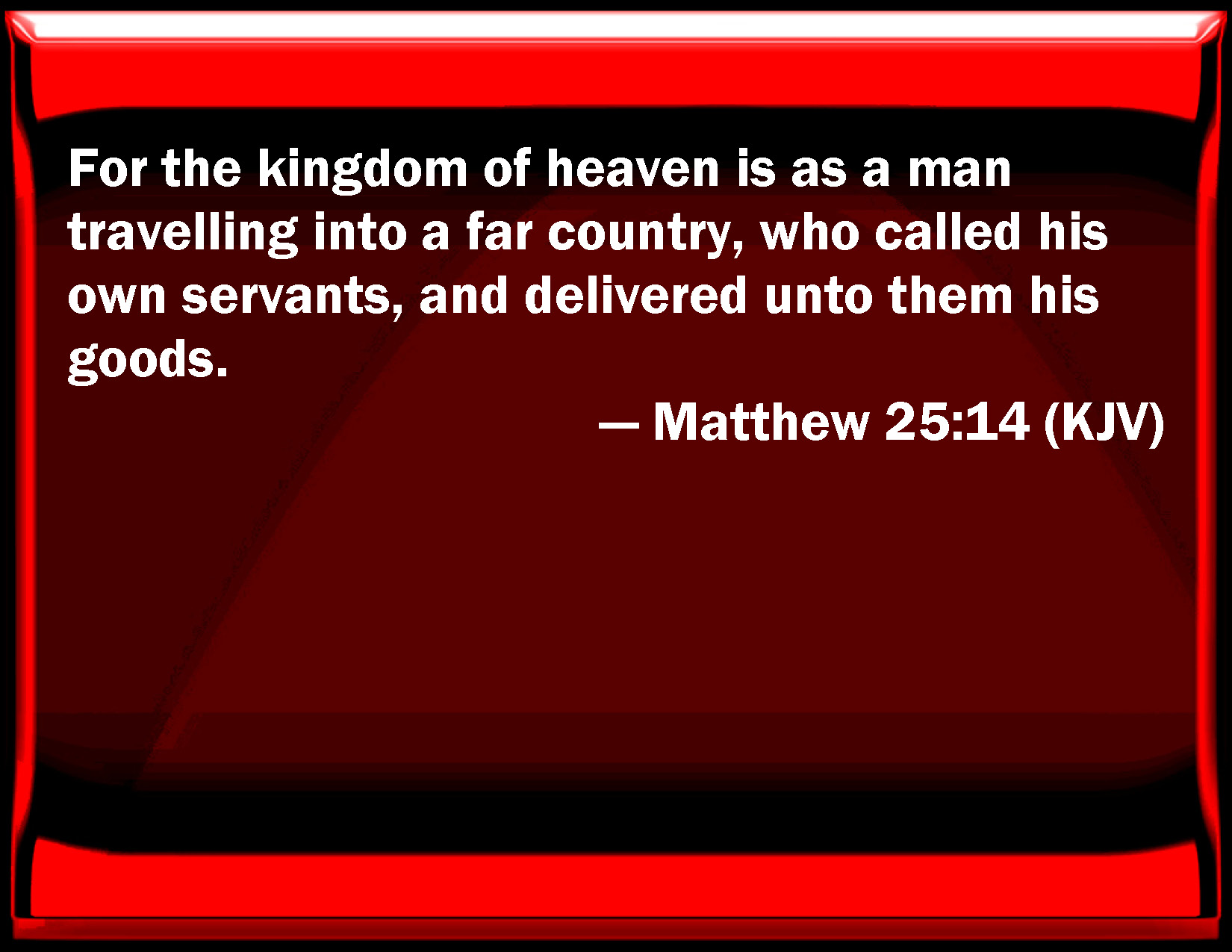 Bible Verse Slide Matthew 25:14 For the kingdom of heaven is as a man traveling into a far country, who called his own servants, and delivered to them his goods. KJV: For the kingdom of heaven is as a man travelling into a far country, who called his own servants, and delivered unto them his goods. DRB: For even as a man going into a far country, called his servants, and delivered to them his goods; DBT: For it is as if a man going away out of a country called his own bondmen and delivered to them his substance. ERV: For it is as when a man, going into another country, called his own servants, and delivered unto them his goods. WBT: For the kingdom of heaven is as a man traveling into a far country, who called his own servants, and delivered to them his goods. WEB: "For it is like a man, going into another country, who called his own servants, and entrusted his goods to them. YLT: For — as a man going abroad did call his own servants, and did deliver to them his substance,Links Matthew 25:14 NIV • Matthew 25:14 NLT • Matthew 25:14 ESV • Matthew 25:14 NASB • Matthew 25:14 KJV • Matthew 25:14 Interlinear • Matthew 25:14 Commentaries • Matthew 25:14 Parallel Texts • Matthew 25:14 Bible Apps • Matthew 25:14 Parallel • Bible Hub |