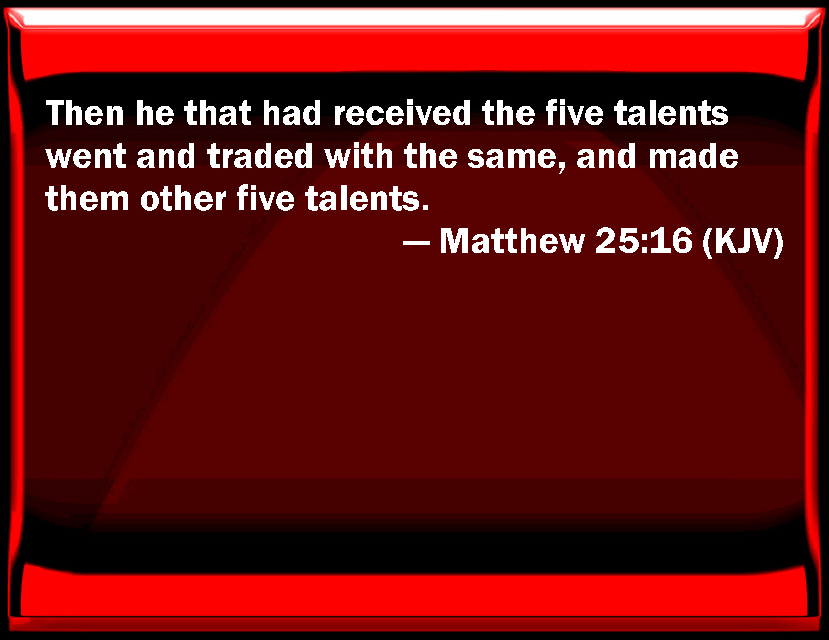 Bible Verse Slide Matthew 25:16 Then he that had received the five talents went and traded with the same, and made them other five talents. KJV: Then he that had received the five talents went and traded with the same, and made them other five talents. DRB: And he that had received the five talents, went his way, and traded with the same, and gained other five. DBT: And he that had received the five talents went and trafficked with them, and made five other talents. ERV: Straightway he that received the five talents went and traded with them, and made other five talents. WBT: Then he that had received the five talents, went and traded with the same, and gained other five talents. WEB: Immediately he who received the five talents went and traded with them, and made another five talents. YLT: 'And he who did receive the five talents, having gone, wrought with them, and made other five talents;Links Matthew 25:16 NIV • Matthew 25:16 NLT • Matthew 25:16 ESV • Matthew 25:16 NASB • Matthew 25:16 KJV • Matthew 25:16 Interlinear • Matthew 25:16 Commentaries • Matthew 25:16 Parallel Texts • Matthew 25:16 Bible Apps • Matthew 25:16 Parallel • Bible Hub |