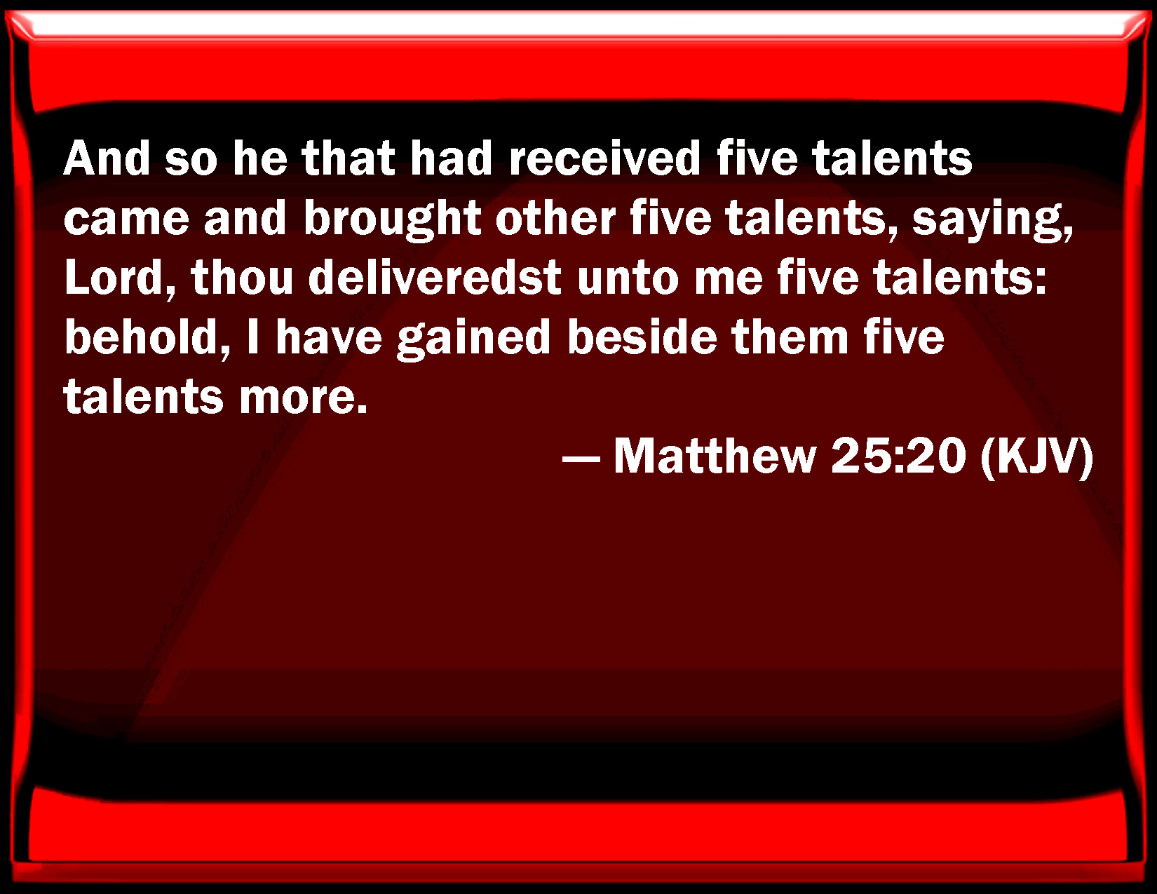 Bible Verse Slide Matthew 25:20 And so he that had received five talents came and brought other five talents, saying, Lord, you delivered to me five talents: behold, I have gained beside them five talents more. KJV: And so he that had received five talents came and brought other five talents, saying, Lord, thou deliveredst unto me five talents: behold, I have gained beside them five talents more. DRB: And he that had received the five talents coming, brought other five talents, saying: Lord, thou didst deliver to me five talents, behold I have gained other five over and above. DBT: And he that had received the five talents came to him and brought five other talents, saying, My lord, thou deliveredst me five talents; behold, I have gained five other talents besides them. ERV: And he that received the five talents came and brought other five talents, saying, Lord, thou deliveredst unto me five talents: lo, I have gained other five talents. WBT: And he that had received five talents, came and brought other five talents, saying, Lord, thou deliveredst to me five talents: behold, I have gained besides them five talents more. WEB: He who received the five talents came and brought another five talents, saying, 'Lord, you delivered to me five talents. Behold, I have gained another five talents besides them.' YLT: and he who did receive the five talents having come, brought other five talents, saying, 'Sir, five talents thou didst deliver to me; lo, other five talents did I gain besides them.Links Matthew 25:20 NIV • Matthew 25:20 NLT • Matthew 25:20 ESV • Matthew 25:20 NASB • Matthew 25:20 KJV • Matthew 25:20 Interlinear • Matthew 25:20 Commentaries • Matthew 25:20 Parallel Texts • Matthew 25:20 Bible Apps • Matthew 25:20 Parallel • Bible Hub |