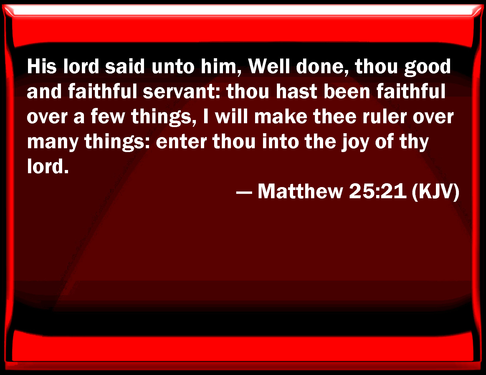 Bible Verse Slide Matthew 25:21 His lord said to him, Well done, you good and faithful servant: you have been faithful over a few things, I will make you ruler over many things: enter you into the joy of your lord. KJV: His lord said unto him, Well done, thou good and faithful servant: thou hast been faithful over a few things, I will make thee ruler over many things: enter thou into the joy of thy lord. DRB: His lord said to him: Well done, good and faithful servant, because thou hast been faithful over a few things, I will place thee over many things: enter thou into the joy of thy lord. DBT: His lord said to him, Well, good and faithful bondman, thou wast faithful over a few things, I will set thee over many things: enter into the joy of thy lord. ERV: His lord said unto him, Well done, good and faithful servant: thou hast been faithful over a few things, I will set thee over many things: enter thou into the joy of thy lord. WBT: His lord said to him, Well done thou good and faithful servant; thou hast been faithful over a few things, I will make thee ruler over many things: enter thou into the joy of thy lord. WEB: "His lord said to him, 'Well done, good and faithful servant. You have been faithful over a few things, I will set you over many things. Enter into the joy of your lord.' YLT: 'And his lord said to him, Well done, servant, good and faithful, over a few things thou wast faithful, over many things I will set thee; enter into the joy of thy lord.Links Matthew 25:21 NIV • Matthew 25:21 NLT • Matthew 25:21 ESV • Matthew 25:21 NASB • Matthew 25:21 KJV • Matthew 25:21 Interlinear • Matthew 25:21 Commentaries • Matthew 25:21 Parallel Texts • Matthew 25:21 Bible Apps • Matthew 25:21 Parallel • Bible Hub |