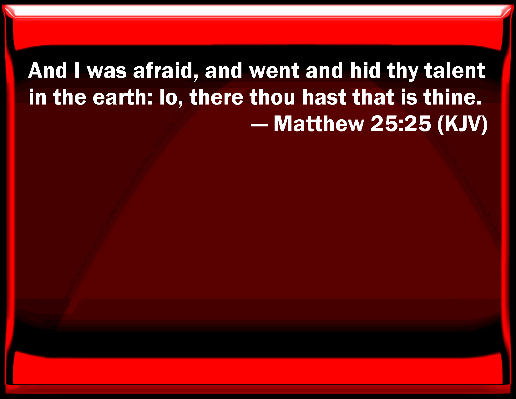 Bible Verse Slide Matthew 25:25 And I was afraid, and went and hid your talent in the earth: see, there you have that is yours. KJV: And I was afraid, and went and hid thy talent in the earth: lo, there thou hast that is thine. DRB: And being afraid I went and hid thy talent in the earth: behold here thou hast that which is thine. DBT: and being afraid I went away and hid thy talent in the earth; behold, thou hast that which is thine. ERV: and I was afraid, and went away and hid thy talent in the earth: lo, thou hast thine own. WBT: And I was afraid, and went and hid thy talent in the earth: lo, there thou hast what is thine. WEB: I was afraid, and went away and hid your talent in the earth. Behold, you have what is yours.' YLT: and having been afraid, having gone away, I hid thy talent in the earth; lo, thou hast thine own!Links Matthew 25:25 NIV • Matthew 25:25 NLT • Matthew 25:25 ESV • Matthew 25:25 NASB • Matthew 25:25 KJV • Matthew 25:25 Interlinear • Matthew 25:25 Commentaries • Matthew 25:25 Parallel Texts • Matthew 25:25 Bible Apps • Matthew 25:25 Parallel • Bible Hub |