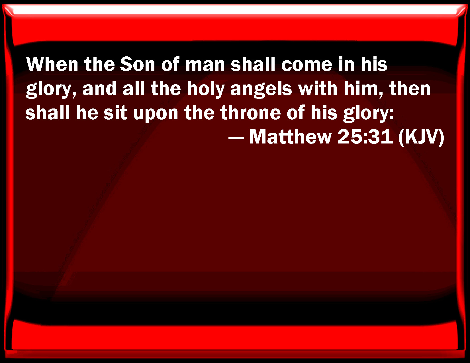 Bible Verse Slide Matthew 25:31 When the Son of man shall come in his glory, and all the holy angels with him, then shall he sit on the throne of his glory: KJV: When the Son of man shall come in his glory, and all the holy angels with him, then shall he sit upon the throne of his glory: DRB: And when the Son of man shall come in his majesty, and all the angels with him, then shall he sit upon the seat of his majesty. DBT: But when the Son of man comes in his glory, and all the angels with him, then shall he sit down upon his throne of glory, ERV: But when the Son of man shall come in his glory, and all the angels with him, then shall he sit on the throne of his glory: WBT: When the Son of man shall come in his glory, and all the holy angels with him, then will he sit upon the throne of his glory: WEB: "But when the Son of Man comes in his glory, and all the holy angels with him, then he will sit on the throne of his glory. YLT: 'And whenever the Son of Man may come in his glory, and all the holy messengers with him, then he shall sit upon a throne of his glory;Links Matthew 25:31 NIV • Matthew 25:31 NLT • Matthew 25:31 ESV • Matthew 25:31 NASB • Matthew 25:31 KJV • Matthew 25:31 Interlinear • Matthew 25:31 Commentaries • Matthew 25:31 Parallel Texts • Matthew 25:31 Bible Apps • Matthew 25:31 Parallel • Bible Hub |