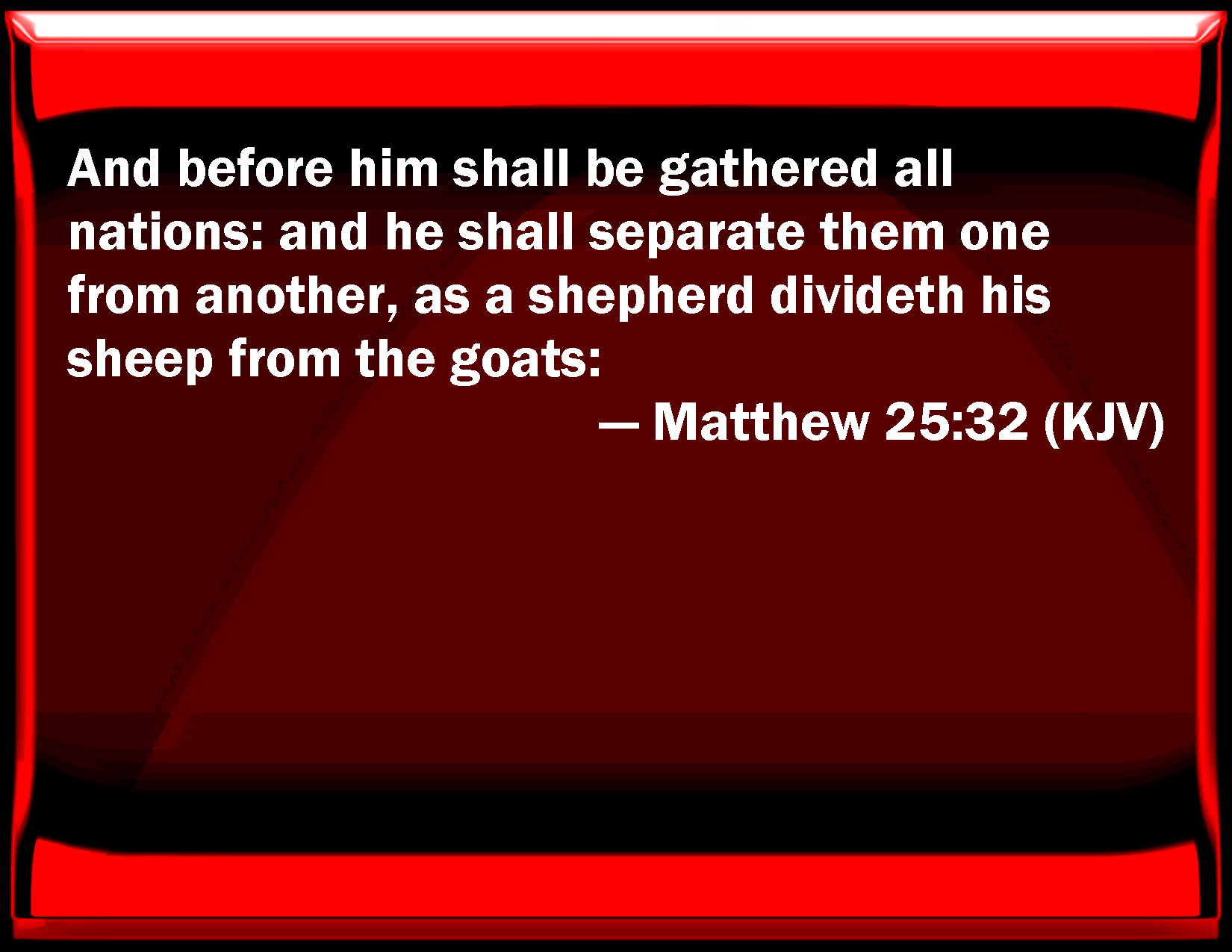 Bible Verse Slide Matthew 25:32 And before him shall be gathered all nations: and he shall separate them one from another, as a shepherd divides his sheep from the goats: KJV: And before him shall be gathered all nations: and he shall separate them one from another, as a shepherd divideth his sheep from the goats: DRB: And all nations shall be gathered together before him, and he shall separate them one from another, as the shepherd separateth the sheep from the goats: DBT: and all the nations shall be gathered before him; and he shall separate them from one another, as the shepherd separates the sheep from the goats; ERV: and before him shall be gathered all the nations: and he shall separate them one from another, as the shepherd separateth the sheep from the goats: WBT: And before him shall be gathered all nations: and he will separate them one from another, as a shepherd divideth his sheep from the goats: WEB: Before him all the nations will be gathered, and he will separate them one from another, as a shepherd separates the sheep from the goats. YLT: and gathered together before him shall be all the nations, and he shall separate them from one another, as the shepherd doth separate the sheep from the goats,Links Matthew 25:32 NIV • Matthew 25:32 NLT • Matthew 25:32 ESV • Matthew 25:32 NASB • Matthew 25:32 KJV • Matthew 25:32 Interlinear • Matthew 25:32 Commentaries • Matthew 25:32 Parallel Texts • Matthew 25:32 Bible Apps • Matthew 25:32 Parallel • Bible Hub |