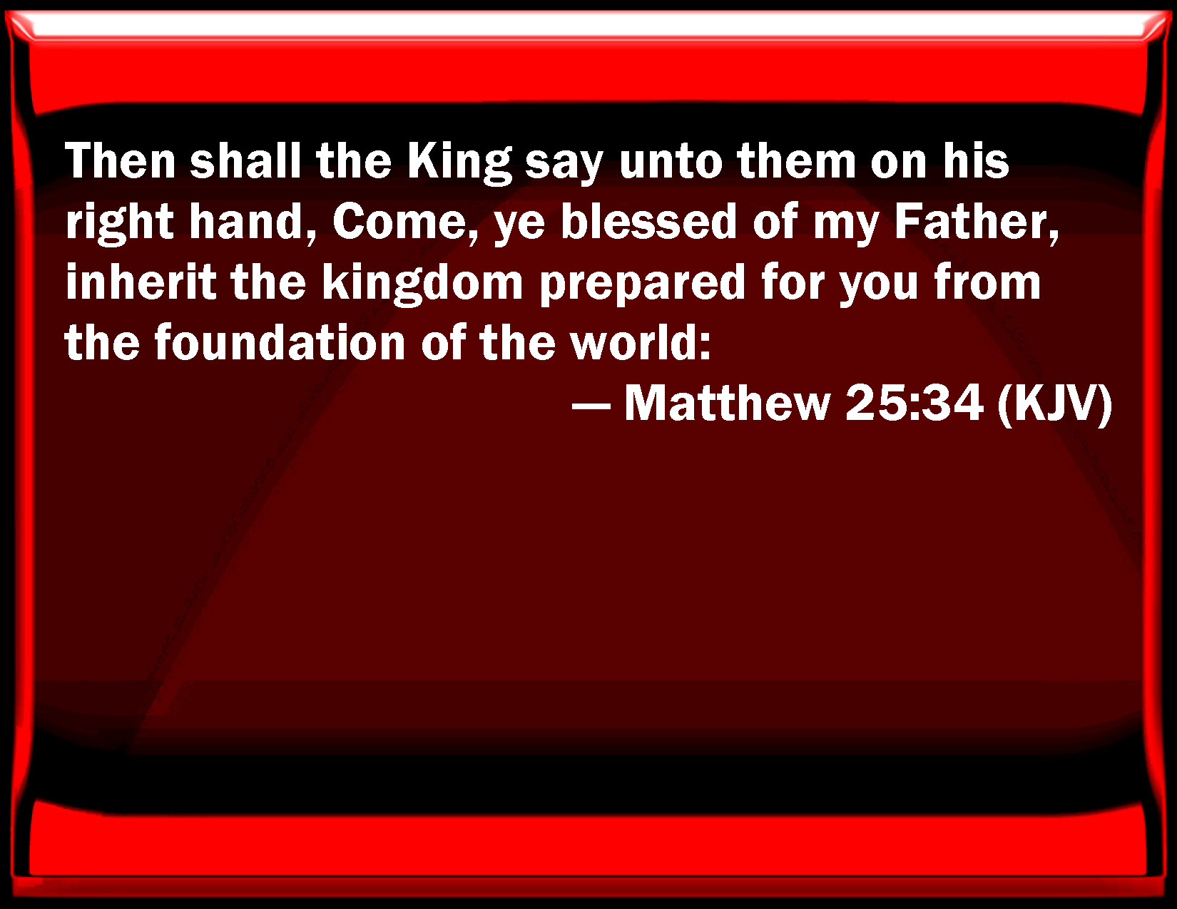 Bible Verse Slide Matthew 25:34 Then shall the King say to them on his right hand, Come, you blessed of my Father, inherit the kingdom prepared for you from the foundation of the world: KJV: Then shall the King say unto them on his right hand, Come, ye blessed of my Father, inherit the kingdom prepared for you from the foundation of the world: DRB: Then shall the king say to them that shall be on his right hand: Come, ye blessed of my Father, possess you the kingdom prepared for you from the foundation of the world. DBT: Then shall the King say to those on his right hand, Come, blessed of my Father, inherit the kingdom prepared for you from the world's foundation: ERV: Then shall the King say unto them on his right hand, Come, ye blessed of my Father, inherit the kingdom prepared for you from the foundation of the world: WBT: Then will the King say to them on his right hand, Come, ye blessed of my Father, inherit the kingdom prepared for you from the foundation of the world: WEB: Then the King will tell those on his right hand, 'Come, blessed of my Father, inherit the Kingdom prepared for you from the foundation of the world; YLT: 'Then shall the king say to those on his right hand, Come ye, the blessed of my Father, inherit the reign that hath been prepared for you from the foundation of the world;Links Matthew 25:34 NIV • Matthew 25:34 NLT • Matthew 25:34 ESV • Matthew 25:34 NASB • Matthew 25:34 KJV • Matthew 25:34 Interlinear • Matthew 25:34 Commentaries • Matthew 25:34 Parallel Texts • Matthew 25:34 Bible Apps • Matthew 25:34 Parallel • Bible Hub |