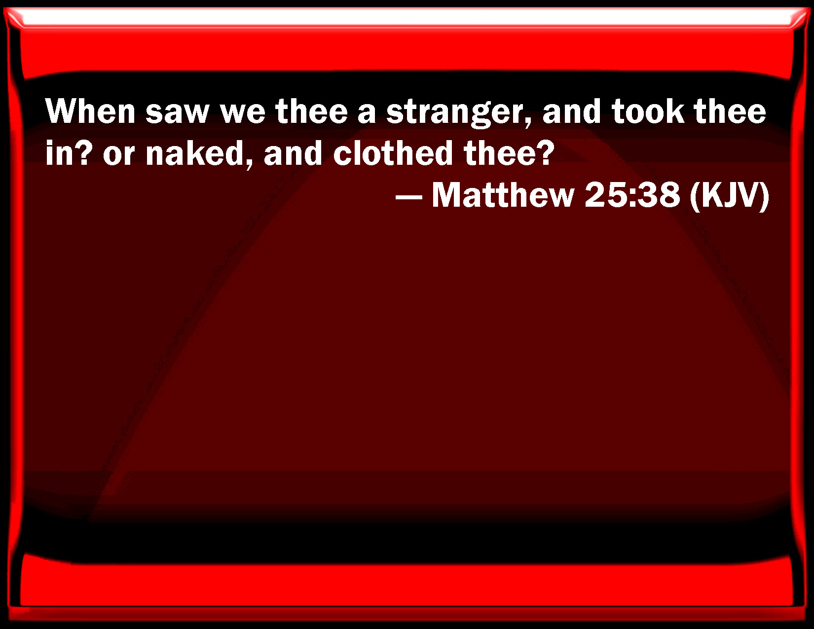 Bible Verse Slide Matthew 25:38 When saw we you a stranger, and took you in? or naked, and clothed you? KJV: When saw we thee a stranger, and took thee in? or naked, and clothed thee? DRB: And when did we see thee a stranger, and took thee in? or naked, and covered thee? DBT: and when saw we thee a stranger, and took thee in; or naked, and clothed thee? ERV: And when saw we thee a stranger, and took thee in? or naked, and clothed thee? WBT: When saw we thee a stranger, and took thee in? or naked, and clothed thee? WEB: When did we see you as a stranger, and take you in; or naked, and clothe you? YLT: and when did we see thee a stranger, and we received? or naked, and we put around?Links Matthew 25:38 NIV • Matthew 25:38 NLT • Matthew 25:38 ESV • Matthew 25:38 NASB • Matthew 25:38 KJV • Matthew 25:38 Interlinear • Matthew 25:38 Commentaries • Matthew 25:38 Parallel Texts • Matthew 25:38 Bible Apps • Matthew 25:38 Parallel • Bible Hub |