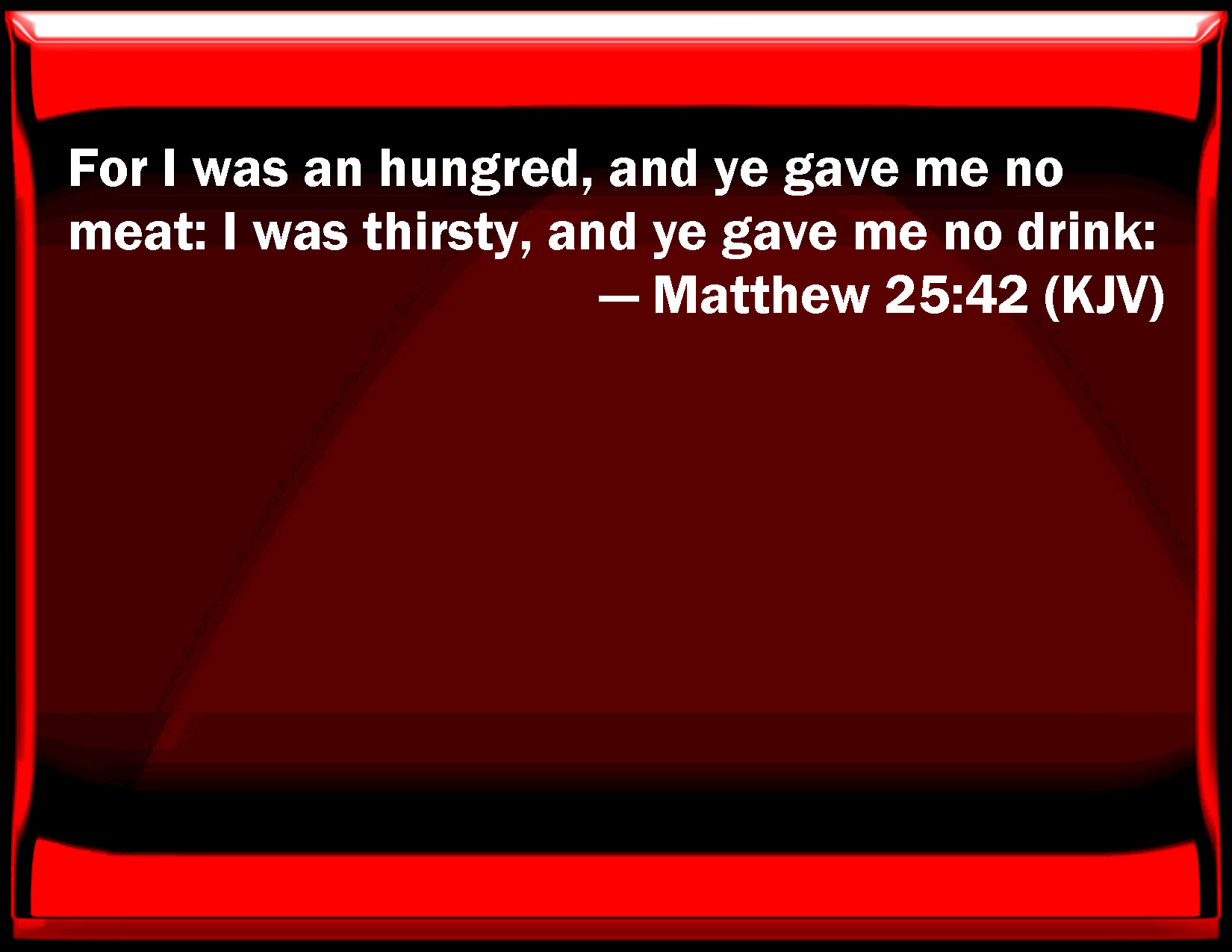 Bible Verse Slide Matthew 25:42 For I was an hungered, and you gave me no meat: I was thirsty, and you gave me no drink: KJV: For I was an hungred, and ye gave me no meat: I was thirsty, and ye gave me no drink: DRB: For I was hungry, and you gave me not to eat: I was thirsty, and you gave me not to drink. DBT: for I hungered, and ye gave me not to eat; I thirsted, and ye gave me not to drink; ERV: for I was an hungred, and ye gave me no meat: I was thirsty, and ye gave me no drink: WBT: For I was hungry, and ye gave me no food: I was thirsty, and ye gave me no drink: WEB: for I was hungry, and you didn't give me food to eat; I was thirsty, and you gave me no drink; YLT: for I did hunger, and ye gave me not to eat; I did thirst, and ye gave me not to drink;Links Matthew 25:42 NIV • Matthew 25:42 NLT • Matthew 25:42 ESV • Matthew 25:42 NASB • Matthew 25:42 KJV • Matthew 25:42 Interlinear • Matthew 25:42 Commentaries • Matthew 25:42 Parallel Texts • Matthew 25:42 Bible Apps • Matthew 25:42 Parallel • Bible Hub |