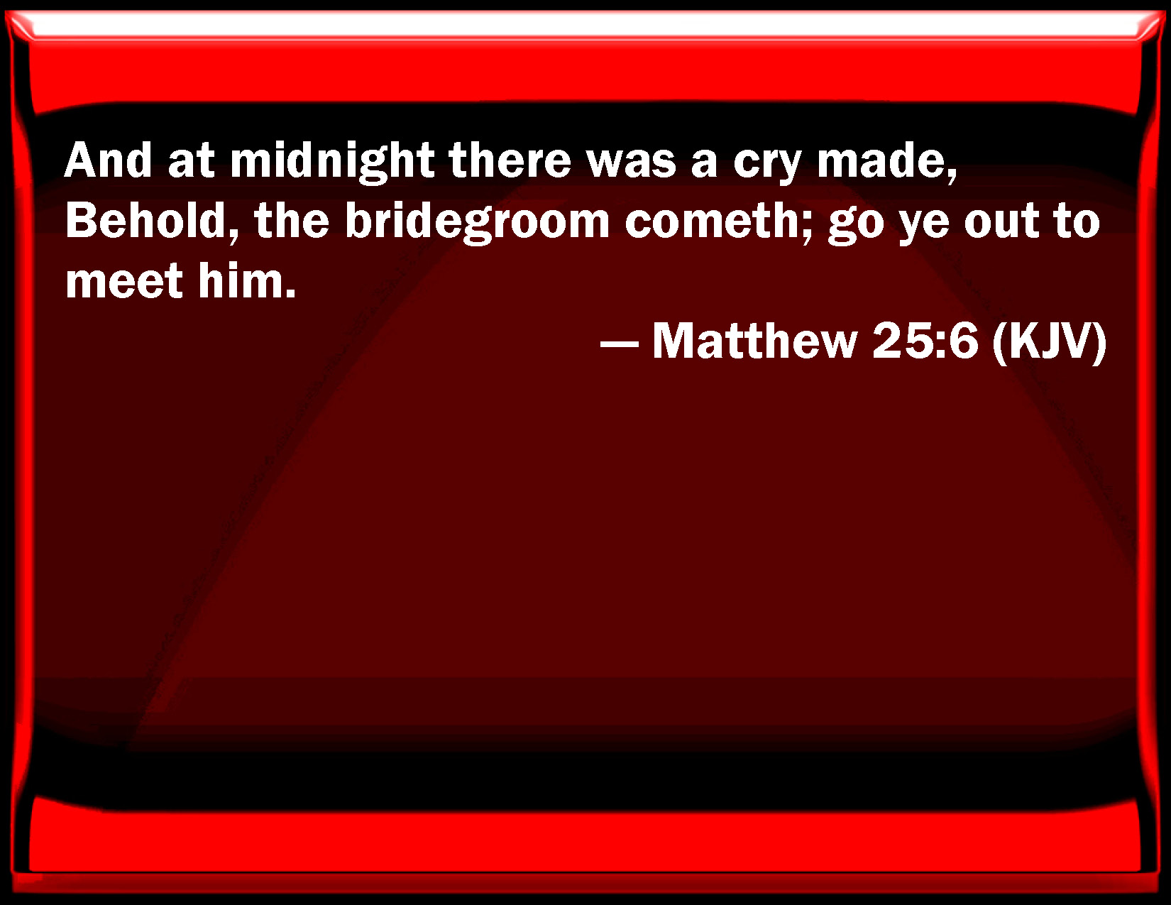 Bible Verse Slide Matthew 25:6 And at midnight there was a cry made, Behold, the bridegroom comes; go you out to meet him. KJV: And at midnight there was a cry made, Behold, the bridegroom cometh; go ye out to meet him. DRB: And at midnight there was a cry made: Behold the bridegroom cometh, go ye forth to meet him. DBT: But in the middle of the night there was a cry, Behold, the bridegroom; go forth to meet him. ERV: But at midnight there is a cry, Behold, the bridegroom! Come ye forth to meet him. WBT: And at midnight there was a cry made, Behold, the bridegroom cometh; go ye out to meet him. WEB: But at midnight there was a cry, 'Behold! The bridegroom is coming! Come out to meet him!' YLT: and in the middle of the night a cry was made, Lo, the bridegroom doth come; go ye forth to meet him.Links Matthew 25:6 NIV • Matthew 25:6 NLT • Matthew 25:6 ESV • Matthew 25:6 NASB • Matthew 25:6 KJV • Matthew 25:6 Interlinear • Matthew 25:6 Commentaries • Matthew 25:6 Parallel Texts • Matthew 25:6 Bible Apps • Matthew 25:6 Parallel • Bible Hub |