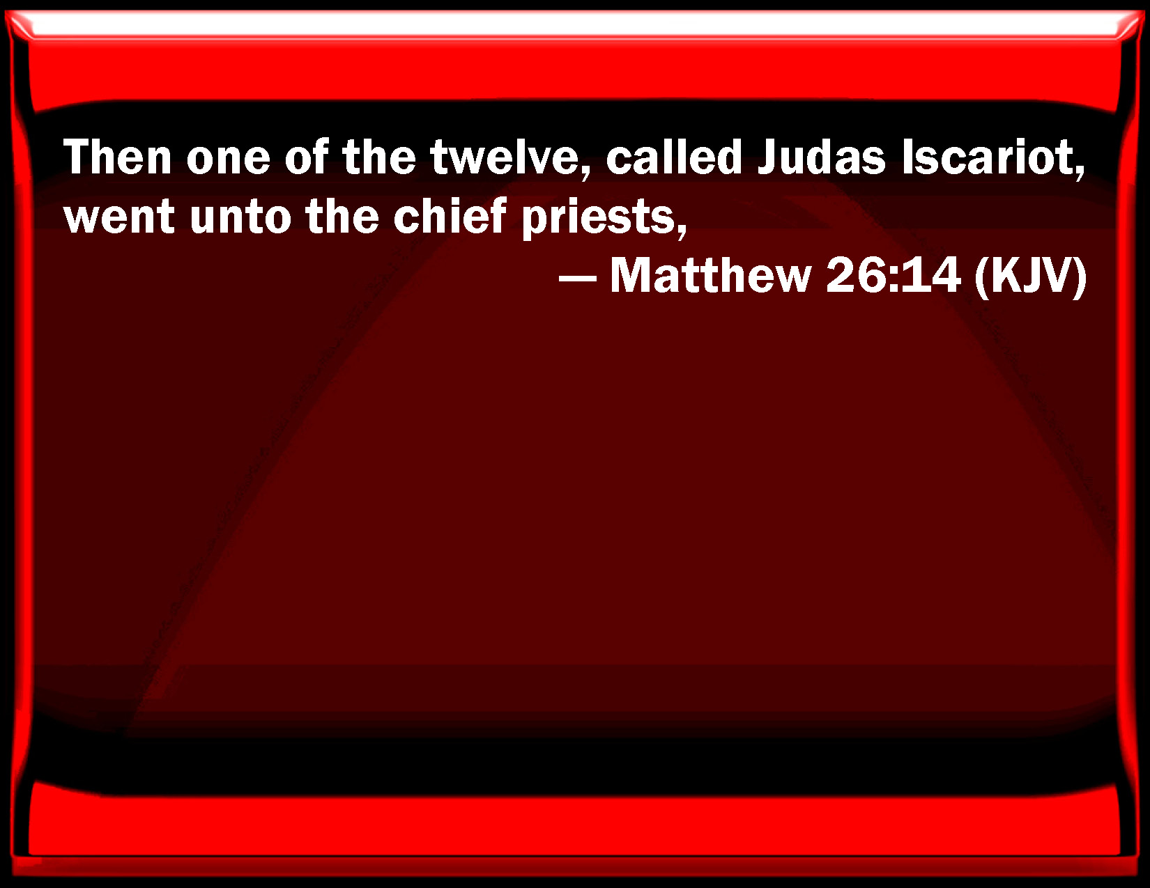 Bible Verse Slide Matthew 26:14 Then one of the twelve, called Judas Iscariot, went to the chief priests, KJV: Then one of the twelve, called Judas Iscariot, went unto the chief priests, DRB: Then went one of the twelve, who was called Judas Iscariot, to the chief priests, DBT: Then one of the twelve, he who was called Judas Iscariote, went to the chief priests ERV: Then one of the twelve, who was called Judas Iscariot, went unto the chief priests, WBT: Then one of the twelve, called Judas Iscariot, went to the chief priests, WEB: Then one of the twelve, who was called Judas Iscariot, went to the chief priests, YLT: Then one of the twelve, who is called Judas Iscariot, having gone unto the chief priests, said,Links Matthew 26:14 NIV • Matthew 26:14 NLT • Matthew 26:14 ESV • Matthew 26:14 NASB • Matthew 26:14 KJV • Matthew 26:14 Interlinear • Matthew 26:14 Commentaries • Matthew 26:14 Parallel Texts • Matthew 26:14 Bible Apps • Matthew 26:14 Parallel • Bible Hub |