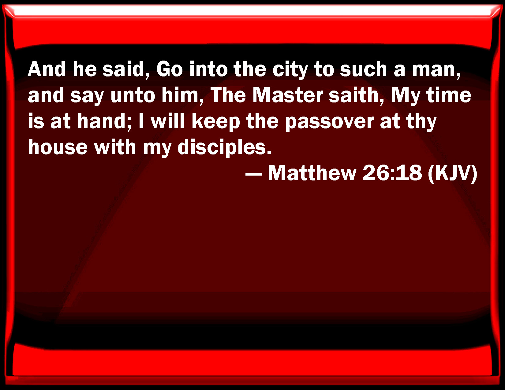 Bible Verse Slide Matthew 26:18 And he said, Go into the city to such a man, and say to him, The Master said, My time is at hand; I will keep the passover at your house with my disciples. KJV: And he said, Go into the city to such a man, and say unto him, The Master saith, My time is at hand; I will keep the passover at thy house with my disciples. DRB: But Jesus said: Go ye into the city to a certain man, and say to him: the master saith, My time is near at hand, with thee I make the pasch with my disciples. DBT: And he said, Go into the city unto such a one, and say to him, The Teacher says, My time is near, I will keep the passover in thy house with my disciples. ERV: And he said, Go into the city to such a man, and say unto him, The Master saith, My time is at hand; I keep the passover at thy house with my disciples. WBT: And he said, Go into the city to such a man, and say to him, The Master saith, My time is at hand; I will keep the passover at thy house with my disciples. WEB: He said, "Go into the city to a certain person, and tell him, 'The Teacher says, "My time is at hand. I will keep the Passover at your house with my disciples."'" YLT: and he said, 'Go away to the city, unto such a one, and say to him, The Teacher saith, My time is nigh; near thee I keep the passover, with my disciples;'Links Matthew 26:18 NIV • Matthew 26:18 NLT • Matthew 26:18 ESV • Matthew 26:18 NASB • Matthew 26:18 KJV • Matthew 26:18 Interlinear • Matthew 26:18 Commentaries • Matthew 26:18 Parallel Texts • Matthew 26:18 Bible Apps • Matthew 26:18 Parallel • Bible Hub |