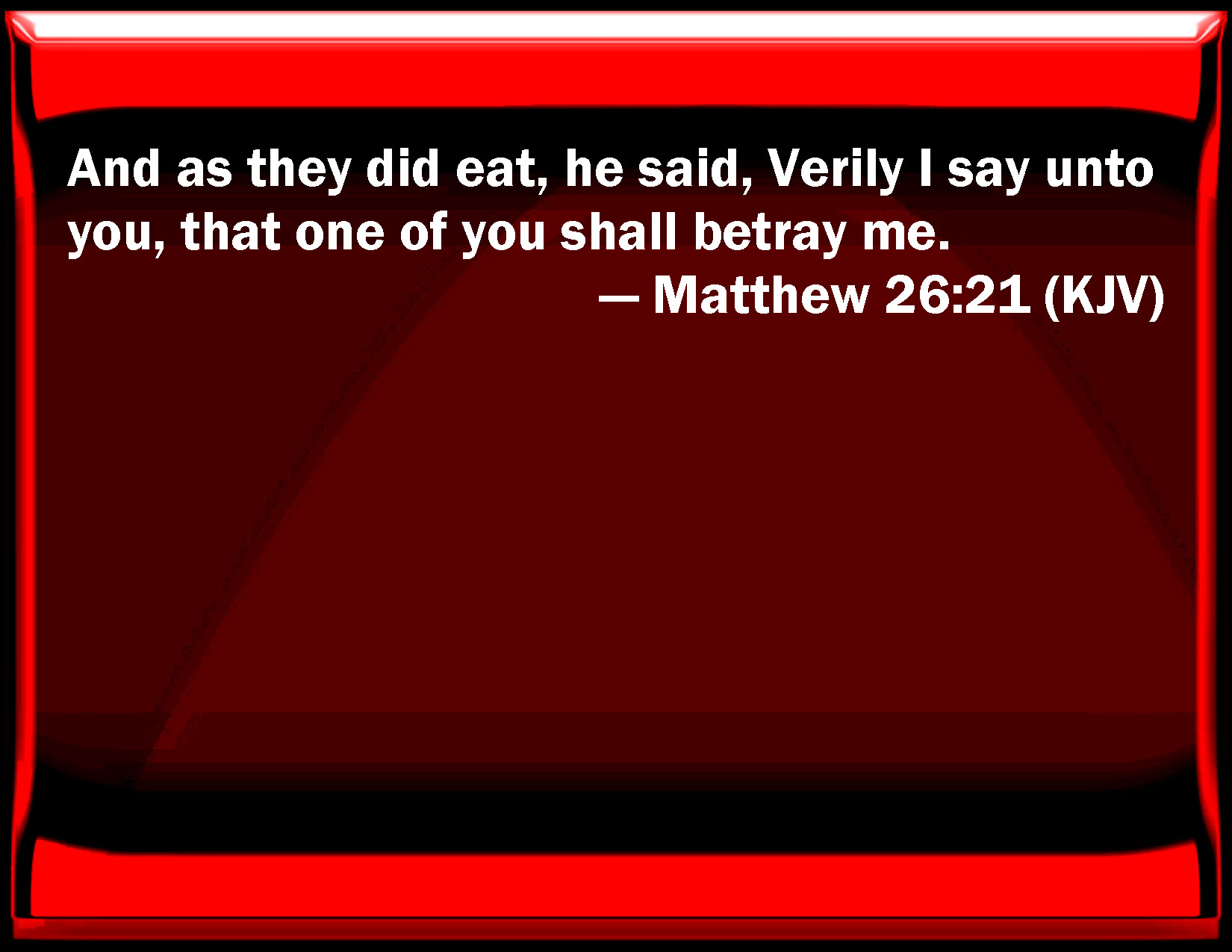 Bible Verse Slide Matthew 26:21 And as they did eat, he said, Truly I say to you, that one of you shall betray me. KJV: And as they did eat, he said, Verily I say unto you, that one of you shall betray me. DRB: And whilst they were eating, he said: Amen I say to you, that one of you is about to betray me. DBT: And as they were eating he said, Verily I say to you, that one of you shall deliver me up. ERV: and as they were eating, he said, Verily I say unto you, that one of you shall betray me. WBT: And as they were eating, he said, Verily I say to you, that one of you will betray me. WEB: As they were eating, he said, "Most certainly I tell you that one of you will betray me." YLT: and while they are eating, he said, 'Verily I say to you, that one of you shall deliver me up.'Links Matthew 26:21 NIV • Matthew 26:21 NLT • Matthew 26:21 ESV • Matthew 26:21 NASB • Matthew 26:21 KJV • Matthew 26:21 Interlinear • Matthew 26:21 Commentaries • Matthew 26:21 Parallel Texts • Matthew 26:21 Bible Apps • Matthew 26:21 Parallel • Bible Hub |