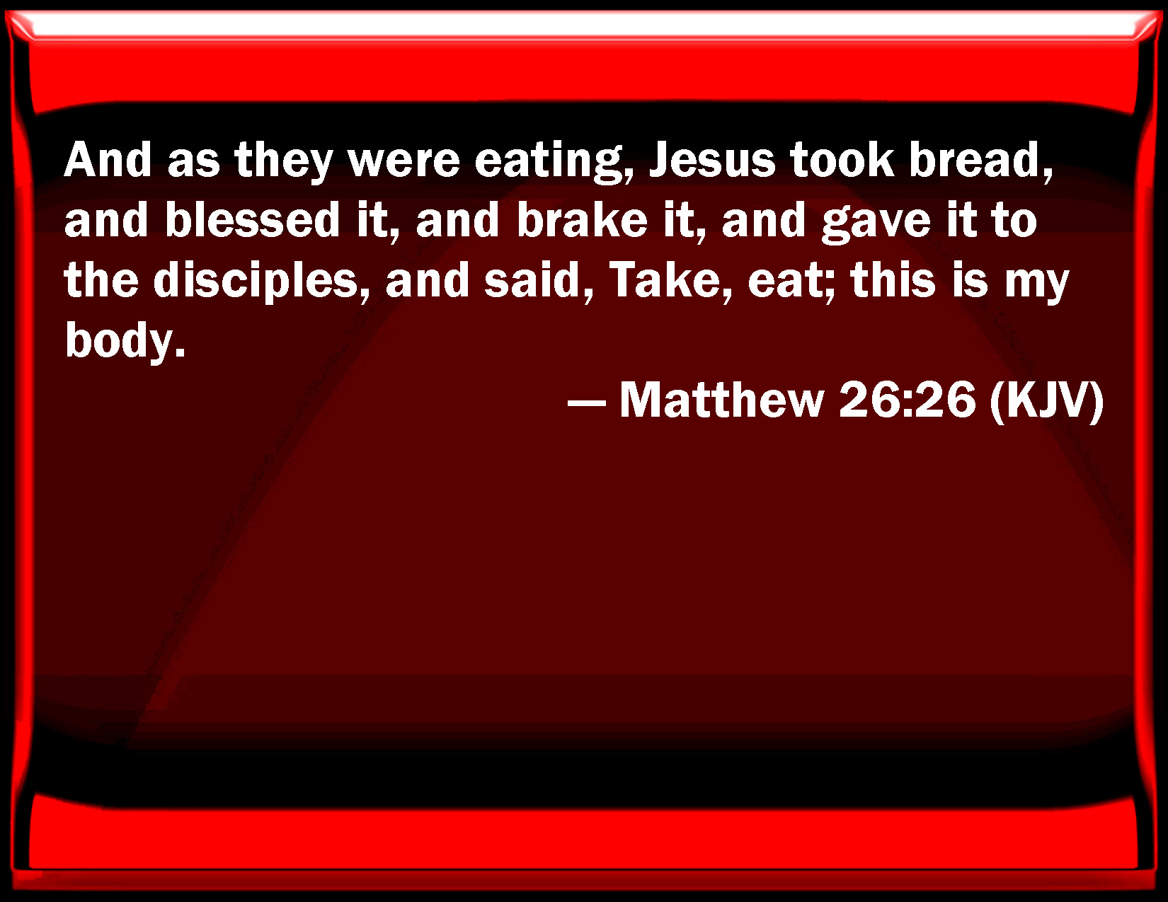 Bible Verse Slide Matthew 26:26 And as they were eating, Jesus took bread, and blessed it, and broke it, and gave it to the disciples, and said, Take, eat; this is my body. KJV: And as they were eating, Jesus took bread, and blessed it, and brake it, and gave it to the disciples, and said, Take, eat; this is my body. DRB: And whilst they were at supper, Jesus took bread, and blessed, and broke: and gave to his disciples, and said: Take ye, and eat. This is my body. DBT: And as they were eating, Jesus, having taken the bread and blessed, broke it and gave it to the disciples, and said, Take, eat: this is my body. ERV: And as they were eating, Jesus took bread, and blessed, and brake it; and he gave to the disciples, and said, Take, eat; this is my body. WBT: And as they were eating, Jesus took bread, and blessed it, and broke it, and gave it to the disciples, and said, Take, eat; this is my body. WEB: As they were eating, Jesus took bread, gave thanks for it, and broke it. He gave to the disciples, and said, "Take, eat; this is my body." YLT: And while they were eating, Jesus having taken the bread, and having blessed, did brake, and was giving to the disciples, and said, 'Take, eat, this is my body;'Links Matthew 26:26 NIV • Matthew 26:26 NLT • Matthew 26:26 ESV • Matthew 26:26 NASB • Matthew 26:26 KJV • Matthew 26:26 Interlinear • Matthew 26:26 Commentaries • Matthew 26:26 Parallel Texts • Matthew 26:26 Bible Apps • Matthew 26:26 Parallel • Bible Hub |