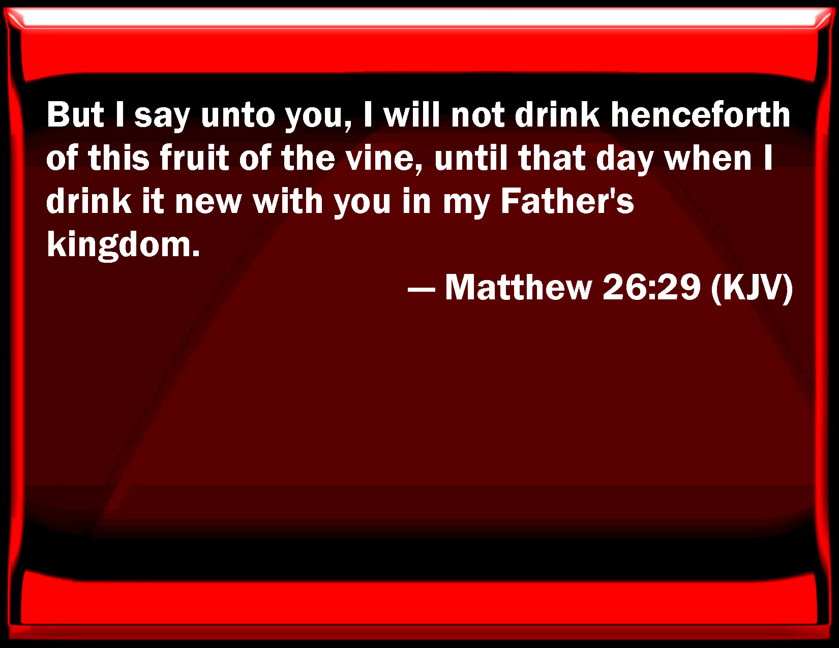 Bible Verse Slide Matthew 26:29 But I say to you, I will not drink from now on of this fruit of the vine, until that day when I drink it new with you in my Father's kingdom. KJV: But I say unto you, I will not drink henceforth of this fruit of the vine, until that day when I drink it new with you in my Father's kingdom. DRB: And I say to you, I will not drink from henceforth of this fruit of the vine, until that day when I shall drink it with you new in the kingdom of my Father. DBT: But I say to you, that I will not at all drink henceforth of this fruit of the vine, until that day when I drink it new with you in the kingdom of my Father. ERV: But I say unto you, I will not drink henceforth of this fruit of the vine, until that day when I drink it new with you in my Father's kingdom. WBT: But I say to you, I will not drink henceforth of this fruit of the vine, until that day when I drink it new with you in my Father's kingdom. WEB: But I tell you that I will not drink of this fruit of the vine from now on, until that day when I drink it anew with you in my Father's Kingdom." YLT: and I say to you, that I may not drink henceforth on this produce of the vine, till that day when I may drink it with you new in the reign of my Father.'Links Matthew 26:29 NIV • Matthew 26:29 NLT • Matthew 26:29 ESV • Matthew 26:29 NASB • Matthew 26:29 KJV • Matthew 26:29 Interlinear • Matthew 26:29 Commentaries • Matthew 26:29 Parallel Texts • Matthew 26:29 Bible Apps • Matthew 26:29 Parallel • Bible Hub |