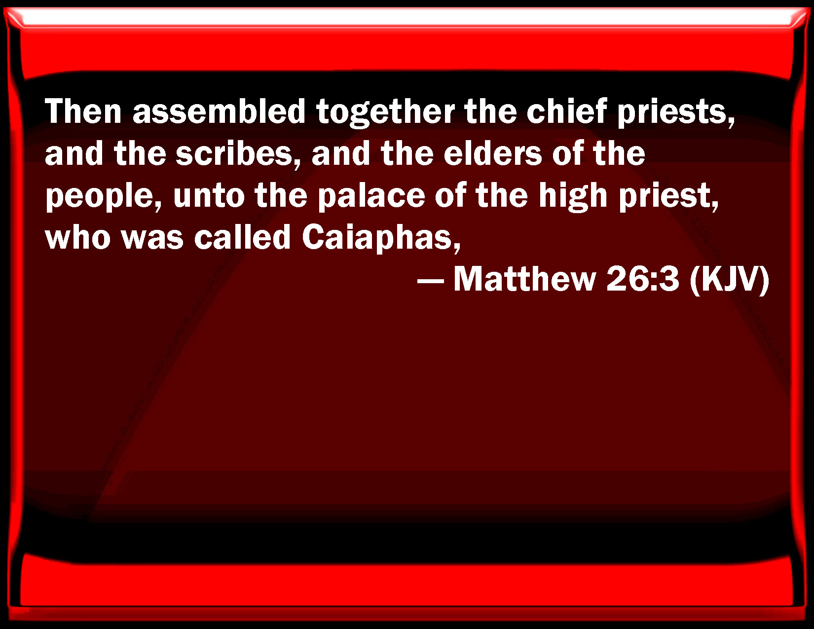 Bible Verse Slide Matthew 26:3 Then assembled together the chief priests, and the scribes, and the elders of the people, to the palace of the high priest, who was called Caiaphas, KJV: Then assembled together the chief priests, and the scribes, and the elders of the people, unto the palace of the high priest, who was called Caiaphas, DRB: Then were gathered together the chief priests and ancients of the people into the court of the high priest, who was called Caiphas: DBT: Then the chief priests and the elders of the people were gathered together to the palace of the high priest who was called Caiaphas, ERV: Then were gathered together the chief priests, and the elders of the people, unto the court of the high priest, who was called Caiaphas; WBT: Then assembled the chief priests, and the scribes, and the elders of the people, in the palace of the high priest, who was called Caiaphas, WEB: Then the chief priests, the scribes, and the elders of the people were gathered together in the court of the high priest, who was called Caiaphas. YLT: Then were gathered together the chief priests, and the scribes, and the elders of the people, to the court of the chief priest who was called Caiaphas;Links Matthew 26:3 NIV • Matthew 26:3 NLT • Matthew 26:3 ESV • Matthew 26:3 NASB • Matthew 26:3 KJV • Matthew 26:3 Interlinear • Matthew 26:3 Commentaries • Matthew 26:3 Parallel Texts • Matthew 26:3 Bible Apps • Matthew 26:3 Parallel • Bible Hub |