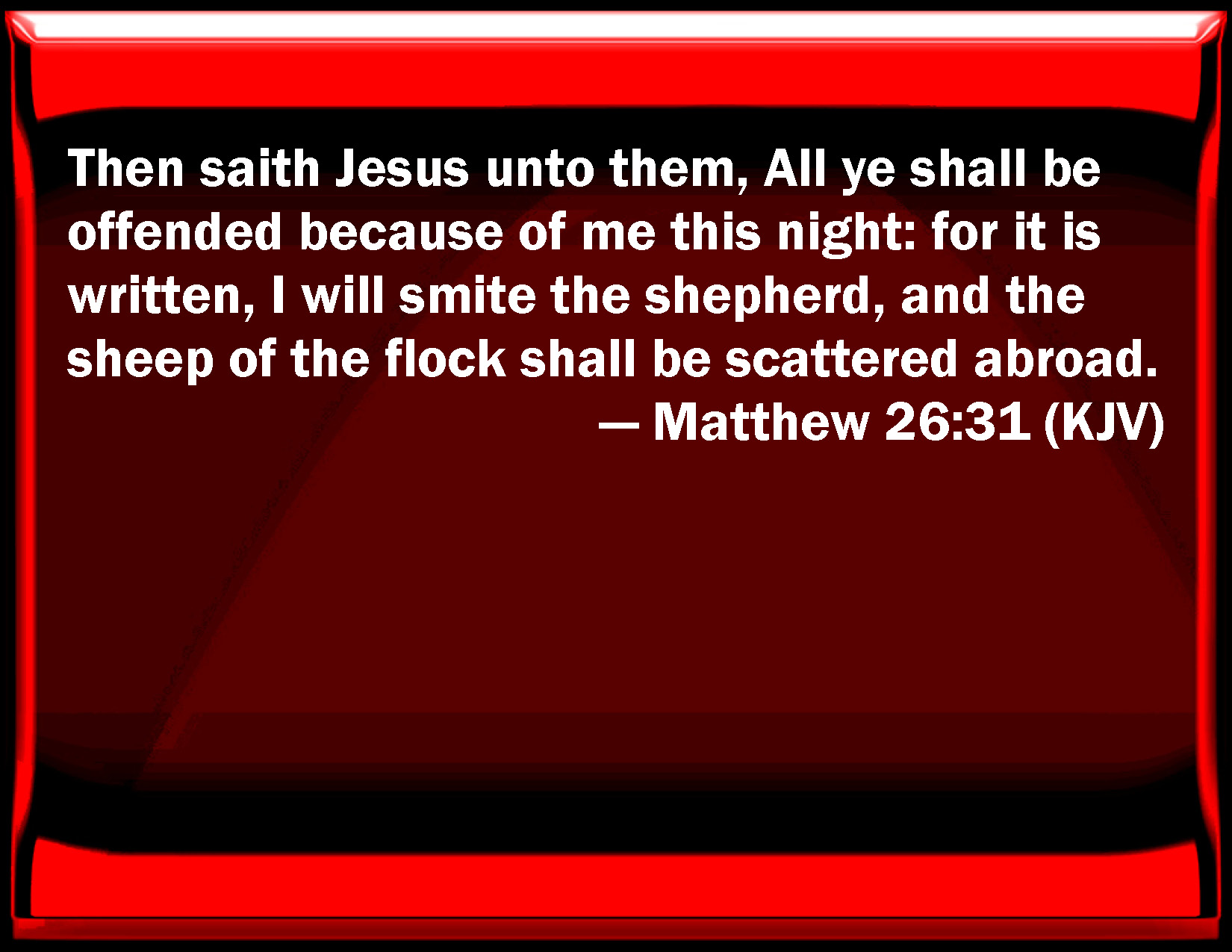 Bible Verse Slide Matthew 26:31 Then said Jesus to them, All you shall be offended because of me this night: for it is written, I will smite the shepherd, and the sheep of the flock shall be scattered abroad. KJV: Then saith Jesus unto them, All ye shall be offended because of me this night: for it is written, I will smite the shepherd, and the sheep of the flock shall be scattered abroad. DRB: Then Jesus said to them: All you shall be scandalized in me this night. For it is written: I will strike the shepherd, and the sheep of the flock shall be dispersed. DBT: Then saith Jesus to them, All ye shall be offended in me during this night. For it is written, I will smite the shepherd, and the sheep of the flock shall be scattered abroad. ERV: Then saith Jesus unto them, All ye shall be offended in me this night: for it is written, I will smite the shepherd, and the sheep of the flock shall be scattered abroad. WBT: Then saith Jesus to them, All ye shall be offended because of me this night: for it is written, I will smite the shepherd, and the sheep of the flock shall be scattered abroad. WEB: Then Jesus said to them, "All of you will be made to stumble because of me tonight, for it is written, 'I will strike the shepherd, and the sheep of the flock will be scattered.' YLT: then saith Jesus to them, 'All ye shall be stumbled at me this night; for it hath been written, I will smite the shepherd, and the sheep of the flock shall be scattered abroad;Links Matthew 26:31 NIV • Matthew 26:31 NLT • Matthew 26:31 ESV • Matthew 26:31 NASB • Matthew 26:31 KJV • Matthew 26:31 Interlinear • Matthew 26:31 Commentaries • Matthew 26:31 Parallel Texts • Matthew 26:31 Bible Apps • Matthew 26:31 Parallel • Bible Hub |