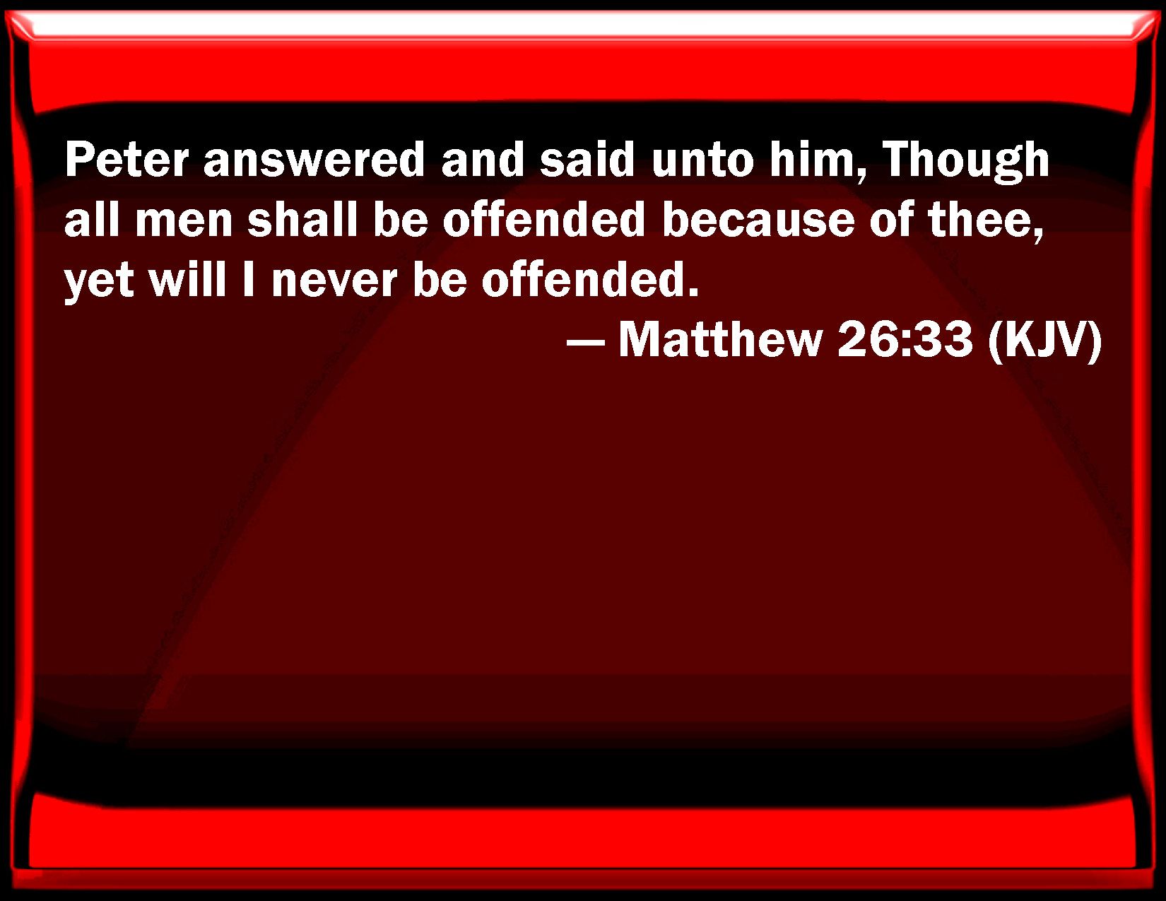 Bible Verse Slide Matthew 26:33 Peter answered and said to him, Though all men shall be offended because of you, yet will I never be offended. KJV: Peter answered and said unto him, Though all men shall be offended because of thee, yet will I never be offended. DRB: And Peter answering, said to him: Although all shall be scandalized in thee, I will never be scandalized. DBT: And Peter answering said to him, If all shall be offended in thee, I will never be offended. ERV: But Peter answered and said unto him, If all shall be offended in thee, I will never be offended. WBT: Peter answered and said to him, Though all men shall be offended because of thee, yet will I never be offended. WEB: But Peter answered him, "Even if all will be made to stumble because of you, I will never be made to stumble." YLT: And Peter answering said to him, 'Even if all shall be stumbled at thee, I will never be stumbled.'Links Matthew 26:33 NIV • Matthew 26:33 NLT • Matthew 26:33 ESV • Matthew 26:33 NASB • Matthew 26:33 KJV • Matthew 26:33 Interlinear • Matthew 26:33 Commentaries • Matthew 26:33 Parallel Texts • Matthew 26:33 Bible Apps • Matthew 26:33 Parallel • Bible Hub |