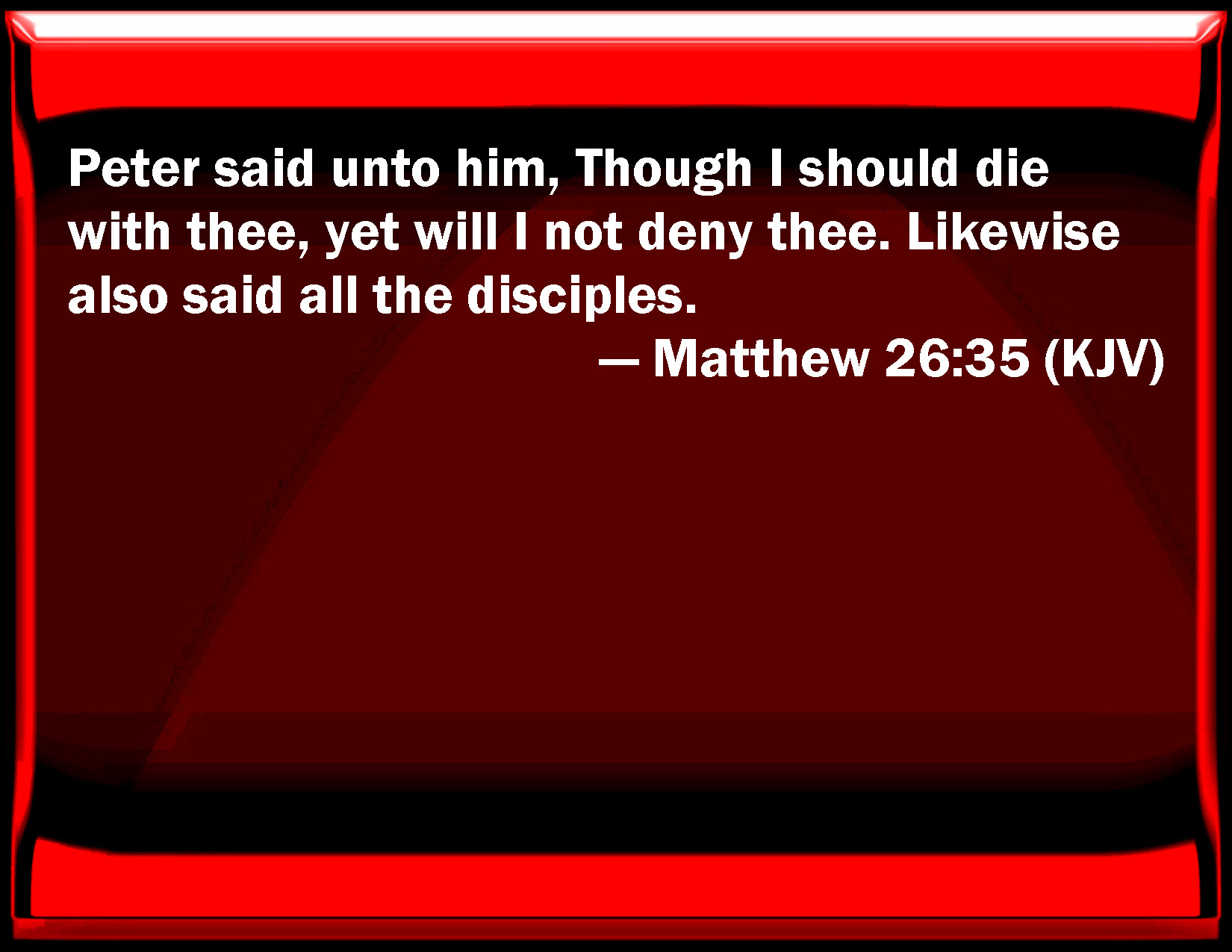 Bible Verse Slide Matthew 26:35 Peter said to him, Though I should die with you, yet will I not deny you. Likewise also said all the disciples. KJV: Peter said unto him, Though I should die with thee, yet will I not deny thee. Likewise also said all the disciples. DRB: Peter saith to him: Yea, though I should die with thee, I will not deny thee. And in like manner said all the disciples. DBT: Peter says to him, If I should needs die with thee, I will in no wise deny thee. Likewise said all the disciples also. ERV: Peter saith unto him, Even if I must die with thee, yet will I not deny thee. Likewise also said all the disciples. WBT: Peter said to him, Though I should die with thee, yet will I not deny thee. Likewise also said all the disciples. WEB: Peter said to him, "Even if I must die with you, I will not deny you." All of the disciples also said likewise. YLT: Peter saith to him, 'Even if it may be necessary for me to die with thee, I will not deny thee;' in like manner also said all the disciples.Links Matthew 26:35 NIV • Matthew 26:35 NLT • Matthew 26:35 ESV • Matthew 26:35 NASB • Matthew 26:35 KJV • Matthew 26:35 Interlinear • Matthew 26:35 Commentaries • Matthew 26:35 Parallel Texts • Matthew 26:35 Bible Apps • Matthew 26:35 Parallel • Bible Hub |
