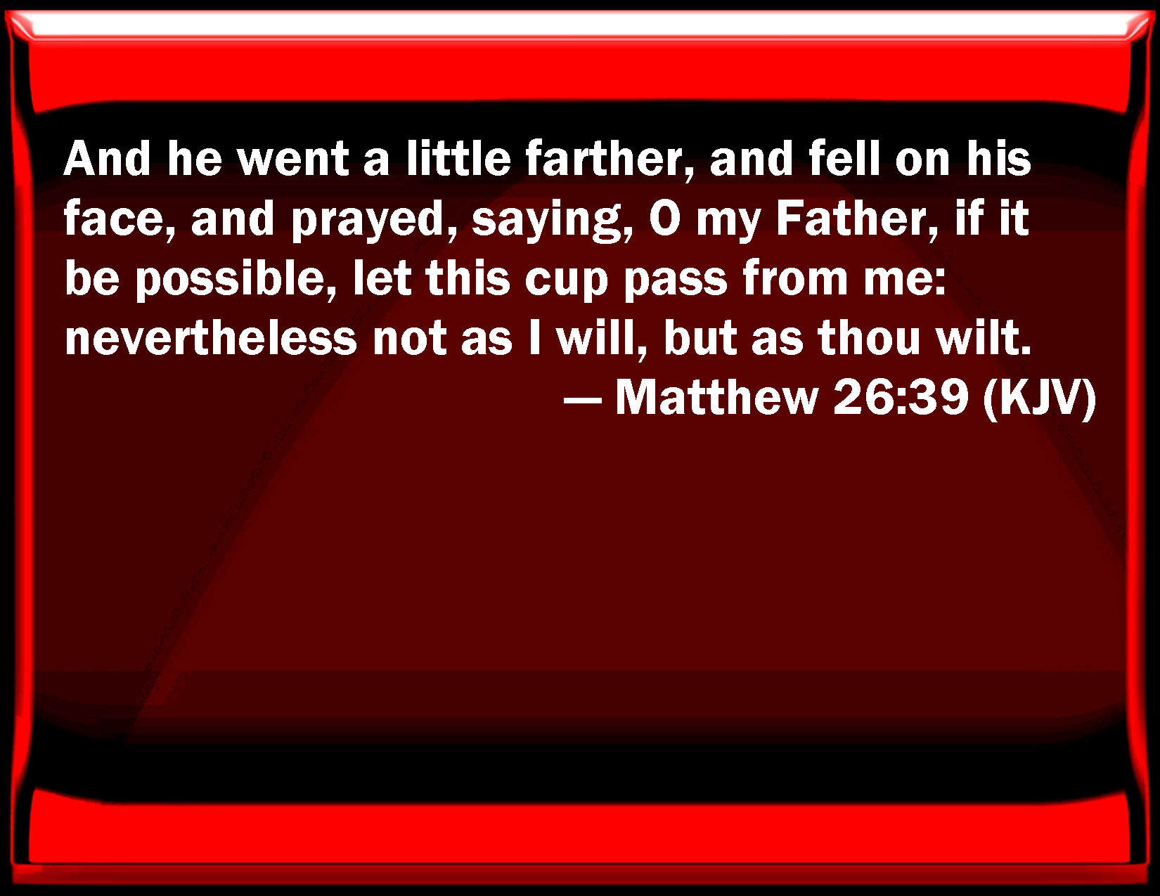 Bible Verse Slide Matthew 26:39 And he went a little farther, and fell on his face, and prayed, saying, O my Father, if it be possible, let this cup pass from me: nevertheless not as I will, but as you will. KJV: And he went a little further, and fell on his face, and prayed, saying, O my Father, if it be possible, let this cup pass from me: nevertheless not as I will, but as thou wilt. DRB: And going a little further, he fell upon his face, praying, and saying: My Father, if it be possible, let this chalice pass from me. Nevertheless not as I will, but as thou wilt. DBT: And going forward a little he fell upon his face, praying and saying, My Father, if it be possible let this cup pass from me; but not as I will, but as thou wilt. ERV: And he went forward a little, and fell on his face, and prayed, saying, O my Father, if it be possible, let this cup pass away from me: nevertheless, not as I will, but as thou wilt. WBT: And he went a little further, and fell on his face, and prayed, saying, O my Father, if it is possible, let this cup pass from me: nevertheless, not as I will, but as thou wilt. WEB: He went forward a little, fell on his face, and prayed, saying, "My Father, if it is possible, let this cup pass away from me; nevertheless, not what I desire, but what you desire." YLT: And having gone forward a little, he fell on his face, praying, and saying, 'My Father, if it be possible, let this cup pass from me; nevertheless, not as I will, but as Thou.'Links Matthew 26:39 NIV • Matthew 26:39 NLT • Matthew 26:39 ESV • Matthew 26:39 NASB • Matthew 26:39 KJV • Matthew 26:39 Interlinear • Matthew 26:39 Commentaries • Matthew 26:39 Parallel Texts • Matthew 26:39 Bible Apps • Matthew 26:39 Parallel • Bible Hub |