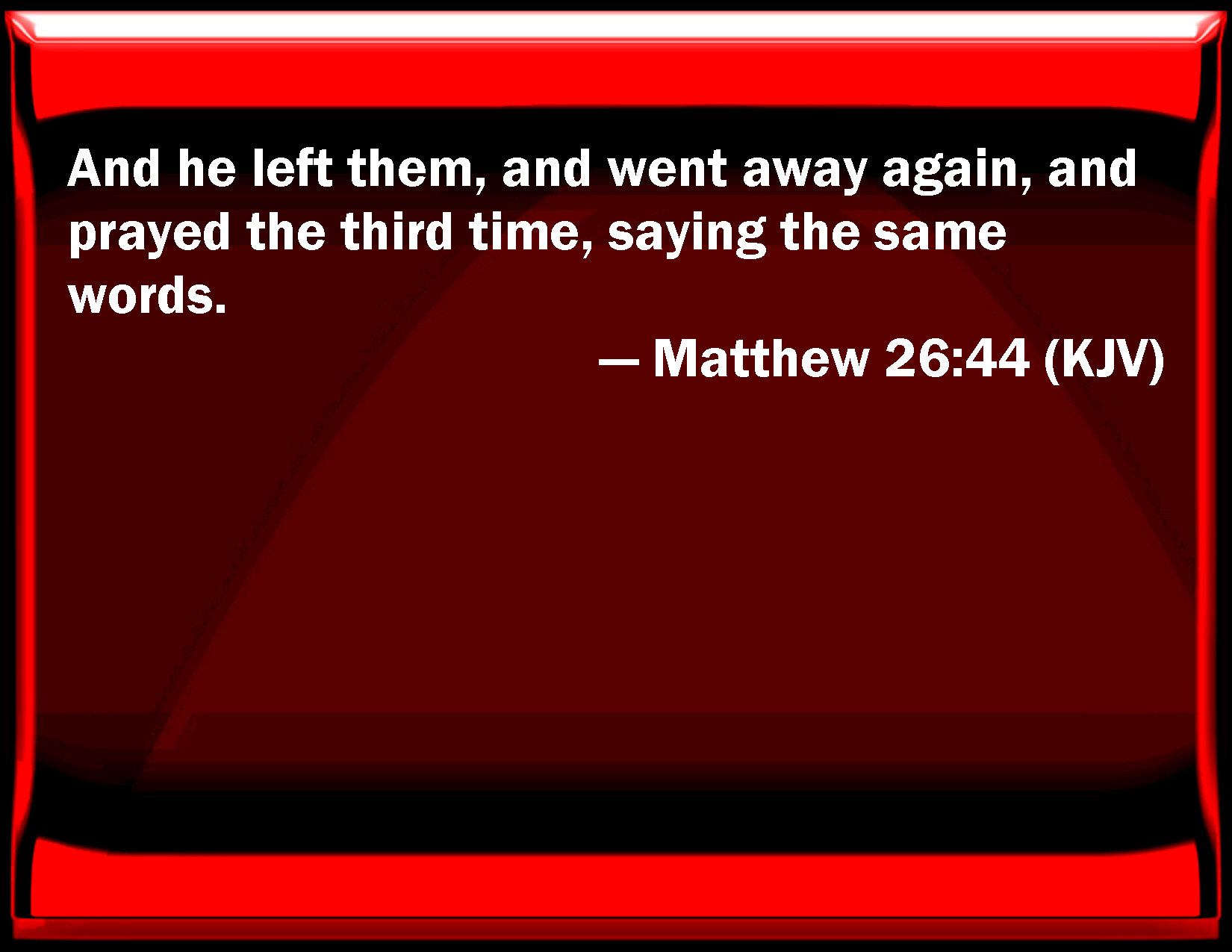Bible Verse Slide Matthew 26:44 And he left them, and went away again, and prayed the third time, saying the same words. KJV: And he left them, and went away again, and prayed the third time, saying the same words. DRB: And leaving them, he went again: and he prayed the third time, saying the selfsame word. DBT: And leaving them, he went away again and prayed the third time, saying the same thing. ERV: And he left them again, and went away, and prayed a third time, saying again the same words. WBT: And he left them, and went away again, and prayed the third time, saying the same words. WEB: He left them again, went away, and prayed a third time, saying the same words. YLT: And having left them, having gone away again, he prayed a third time, saying the same word;Links Matthew 26:44 NIV • Matthew 26:44 NLT • Matthew 26:44 ESV • Matthew 26:44 NASB • Matthew 26:44 KJV • Matthew 26:44 Interlinear • Matthew 26:44 Commentaries • Matthew 26:44 Parallel Texts • Matthew 26:44 Bible Apps • Matthew 26:44 Parallel • Bible Hub |