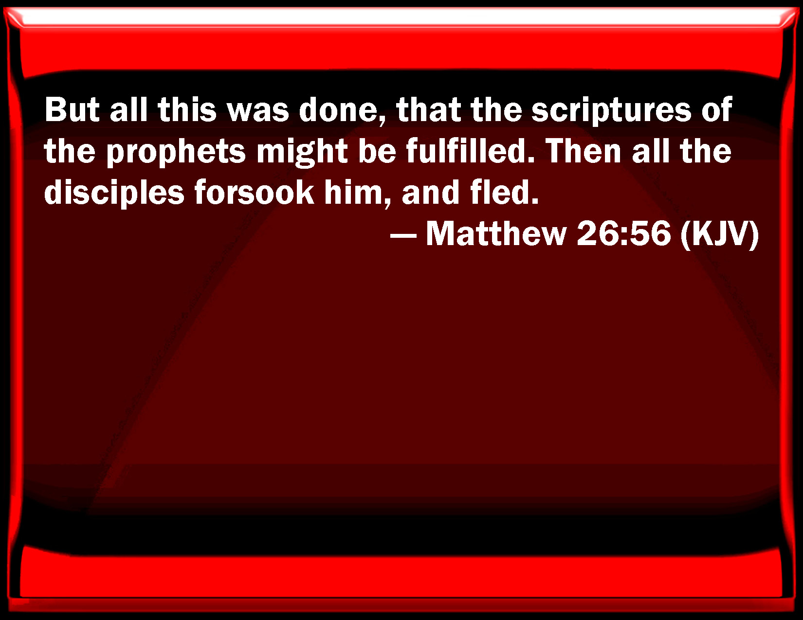 Bible Verse Slide Matthew 26:56 But all this was done, that the scriptures of the prophets might be fulfilled. Then all the disciples forsook him, and fled. KJV: But all this was done, that the scriptures of the prophets might be fulfilled. Then all the disciples forsook him, and fled. DRB: Now all this was done, that the scriptures of the prophets might be fulfilled. Then the disciples all leaving him, fled. DBT: But all this is come to pass that the scriptures of the prophets may be fulfilled. Then all the disciples left him and fled. ERV: But all this is come to pass, that the scriptures of the prophets might be fulfilled. Then all the disciples left him, and fled. WBT: But all this was done, that the scriptures of the prophets might be fulfilled. Then all the disciples forsook him, and fled. WEB: But all this has happened, that the Scriptures of the prophets might be fulfilled." Then all the disciples left him, and fled. YLT: but all this hath come to pass, that the Writings of the prophets may be fulfilled;' then all the disciples, having left him, fled.Links Matthew 26:56 NIV • Matthew 26:56 NLT • Matthew 26:56 ESV • Matthew 26:56 NASB • Matthew 26:56 KJV • Matthew 26:56 Interlinear • Matthew 26:56 Commentaries • Matthew 26:56 Parallel Texts • Matthew 26:56 Bible Apps • Matthew 26:56 Parallel • Bible Hub |