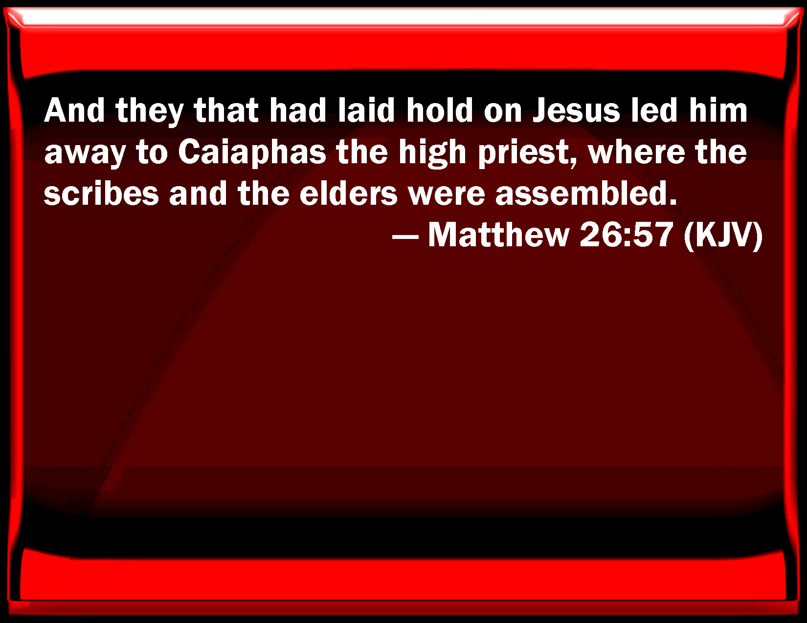 Bible Verse Slide Matthew 26:57 And they that had laid hold on Jesus led him away to Caiaphas the high priest, where the scribes and the elders were assembled. KJV: And they that had laid hold on Jesus led him away to Caiaphas the high priest, where the scribes and the elders were assembled. DRB: But they holding Jesus led him to Caiphas the high priest, where the scribes and the ancients were assembled. DBT: Now they that had seized Jesus led him away to Caiaphas the high priest, where the scribes and the elders were assembled. ERV: And they that had taken Jesus led him away to the house of Caiaphas the high priest, where the scribes and the elders were gathered together. WBT: And they that had laid hold on Jesus, led him away to Caiaphas the high priest, where the scribes and the elders were assembled. WEB: Those who had taken Jesus led him away to Caiaphas the high priest, where the scribes and the elders were gathered together. YLT: And those laying hold on Jesus led him away unto Caiaphas the chief priest, where the scribes and the elders were gathered together,Links Matthew 26:57 NIV • Matthew 26:57 NLT • Matthew 26:57 ESV • Matthew 26:57 NASB • Matthew 26:57 KJV • Matthew 26:57 Interlinear • Matthew 26:57 Commentaries • Matthew 26:57 Parallel Texts • Matthew 26:57 Bible Apps • Matthew 26:57 Parallel • Bible Hub |