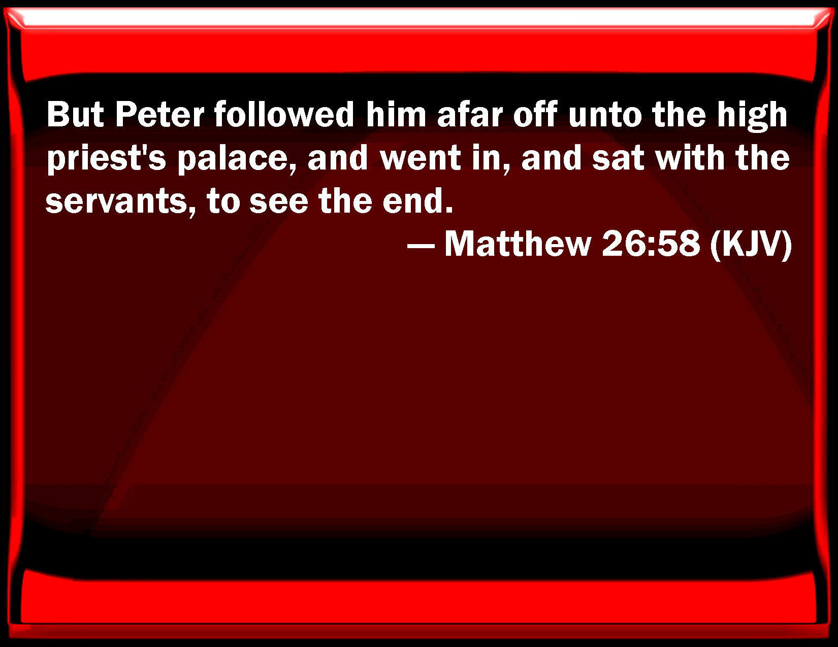 Bible Verse Slide Matthew 26:58 But Peter followed him afar off to the high priest's palace, and went in, and sat with the servants, to see the end. KJV: But Peter followed him afar off unto the high priest's palace, and went in, and sat with the servants, to see the end. DRB: And Peter followed him afar off, even to the court of the high priest. And going in, he sat with the servants, that he might see the end. DBT: And Peter followed him at a distance, even to the palace of the high priest, and entering in sat with the officers to see the end. ERV: But Peter followed him afar off, unto the court of the high priest, and entered in, and sat with the officers, to see the end. WBT: But Peter followed him at a distance, to the high priest's palace, and went in, and sat with the servants to see the end. WEB: But Peter followed him from a distance, to the court of the high priest, and entered in and sat with the officers, to see the end. YLT: and Peter was following him afar off, unto the court of the chief priest, and having gone in within, he was sitting with the officers, to see the end.Links Matthew 26:58 NIV • Matthew 26:58 NLT • Matthew 26:58 ESV • Matthew 26:58 NASB • Matthew 26:58 KJV • Matthew 26:58 Interlinear • Matthew 26:58 Commentaries • Matthew 26:58 Parallel Texts • Matthew 26:58 Bible Apps • Matthew 26:58 Parallel • Bible Hub |