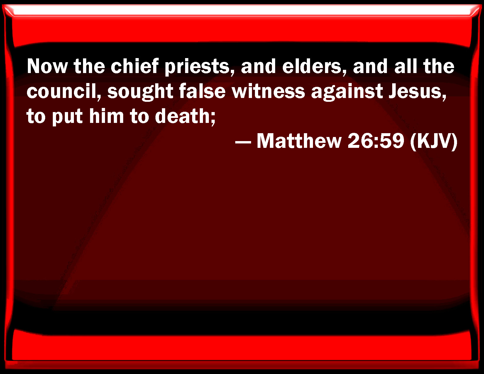 Bible Verse Slide Matthew 26:59 Now the chief priests, and elders, and all the council, sought false witness against Jesus, to put him to death; KJV: Now the chief priests, and elders, and all the council, sought false witness against Jesus, to put him to death; DRB: And the chief priests and the whole council sought false witness against Jesus, that they might put him to death: DBT: And the chief priests and the elders and the whole sanhedrim sought false witness against Jesus, so that they might put him to death. ERV: Now the chief priests and the whole council sought false witness against Jesus, that they might put him to death; WBT: Now the chief priests and elders, and all the council, sought false testimony against Jesus, to put him to death; WEB: Now the chief priests, the elders, and the whole council sought false testimony against Jesus, that they might put him to death; YLT: And the chief priests, and the elders, and all the council, were seeking false witness against Jesus, that they might put him to death,Links Matthew 26:59 NIV • Matthew 26:59 NLT • Matthew 26:59 ESV • Matthew 26:59 NASB • Matthew 26:59 KJV • Matthew 26:59 Interlinear • Matthew 26:59 Commentaries • Matthew 26:59 Parallel Texts • Matthew 26:59 Bible Apps • Matthew 26:59 Parallel • Bible Hub |