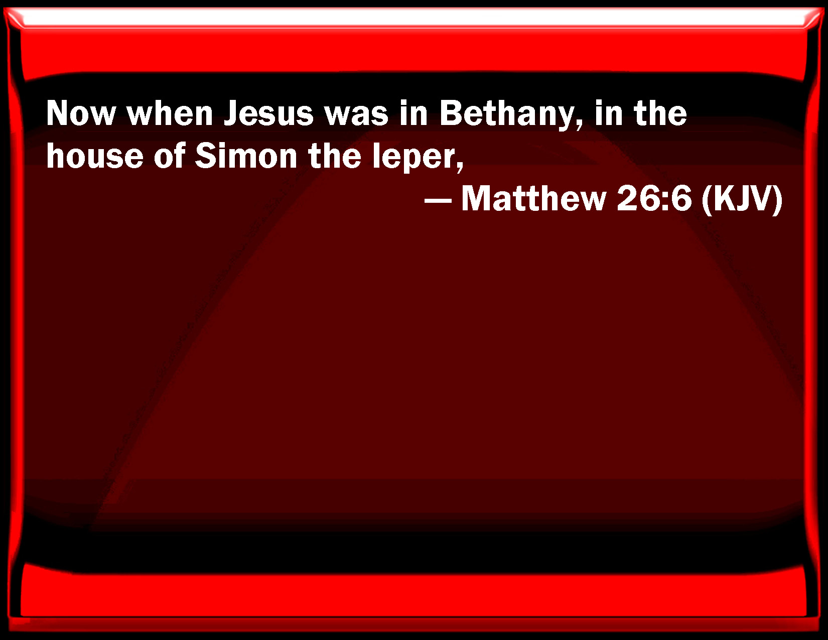 Bible Verse Slide Matthew 26:6 Now when Jesus was in Bethany, in the house of Simon the leper, KJV: Now when Jesus was in Bethany, in the house of Simon the leper, DRB: And when Jesus was in Bethania, in the house of Simon the leper, DBT: But Jesus being in Bethany, in Simon the leper's house, ERV: Now when Jesus was in Bethany, in the house of Simon the leper, WBT: Now when Jesus was in Bethany, in the house of Simon the leper, WEB: Now when Jesus was in Bethany, in the house of Simon the leper, YLT: And Jesus having been in Bethany, in the house of Simon the leper,Links Matthew 26:6 NIV • Matthew 26:6 NLT • Matthew 26:6 ESV • Matthew 26:6 NASB • Matthew 26:6 KJV • Matthew 26:6 Interlinear • Matthew 26:6 Commentaries • Matthew 26:6 Parallel Texts • Matthew 26:6 Bible Apps • Matthew 26:6 Parallel • Bible Hub |