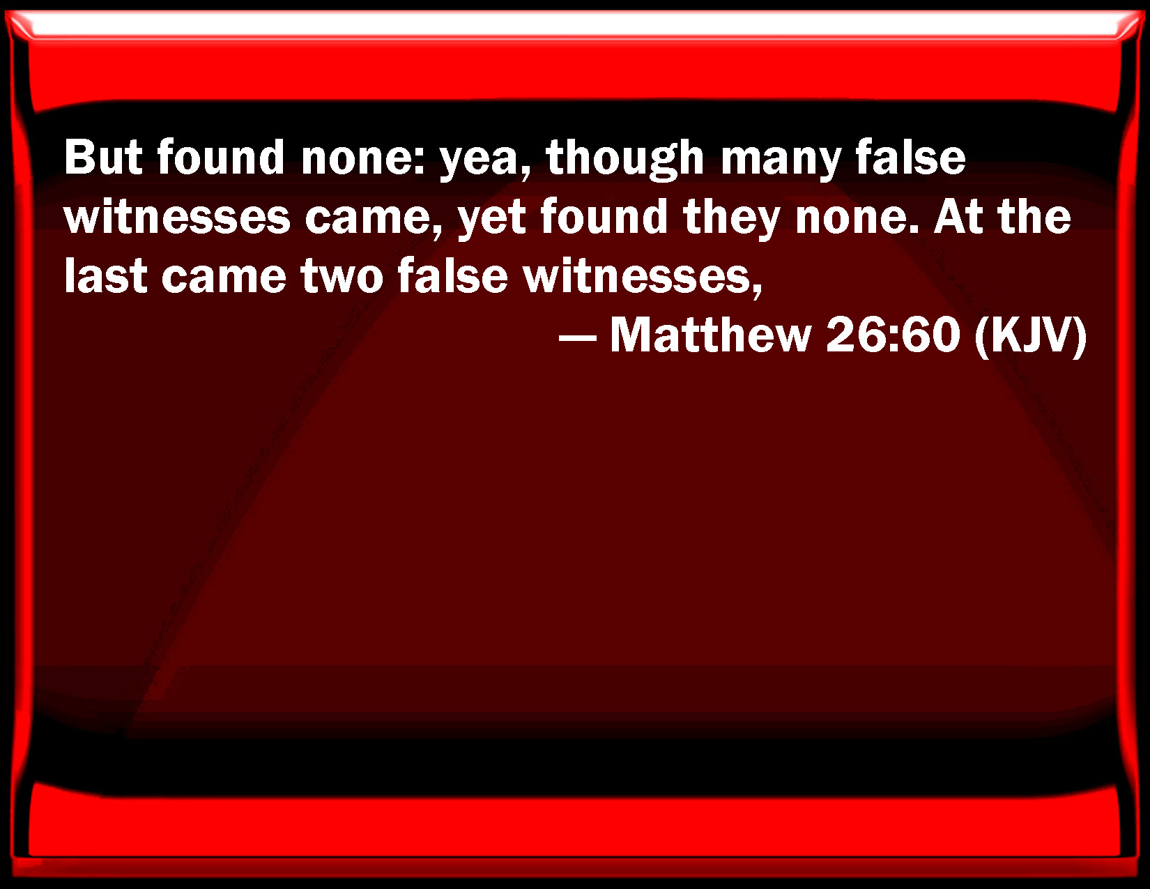 Bible Verse Slide Matthew 26:60 But found none: yes, though many false witnesses came, yet found they none. At the last came two false witnesses, KJV: But found none: yea, though many false witnesses came, yet found they none. At the last came two false witnesses, DRB: And they found not, whereas many false witnesses had come in. And last of all there came two false witnesses: DBT: And they found none, though many false witnesses came forward. But at the last two false witnesses came forward ERV: and they found it not, though many false witnesses came. But afterward came two, WBT: But found none: and, though many false witnesses came, yet found they none. At the last came two false witnesses, WEB: and they found none. Even though many false witnesses came forward, they found none. But at last two false witnesses came forward, YLT: and they did not find; and many false witnesses having come near, they did not find; and at last two false witnesses having come near,Links Matthew 26:60 NIV • Matthew 26:60 NLT • Matthew 26:60 ESV • Matthew 26:60 NASB • Matthew 26:60 KJV • Matthew 26:60 Interlinear • Matthew 26:60 Commentaries • Matthew 26:60 Parallel Texts • Matthew 26:60 Bible Apps • Matthew 26:60 Parallel • Bible Hub |