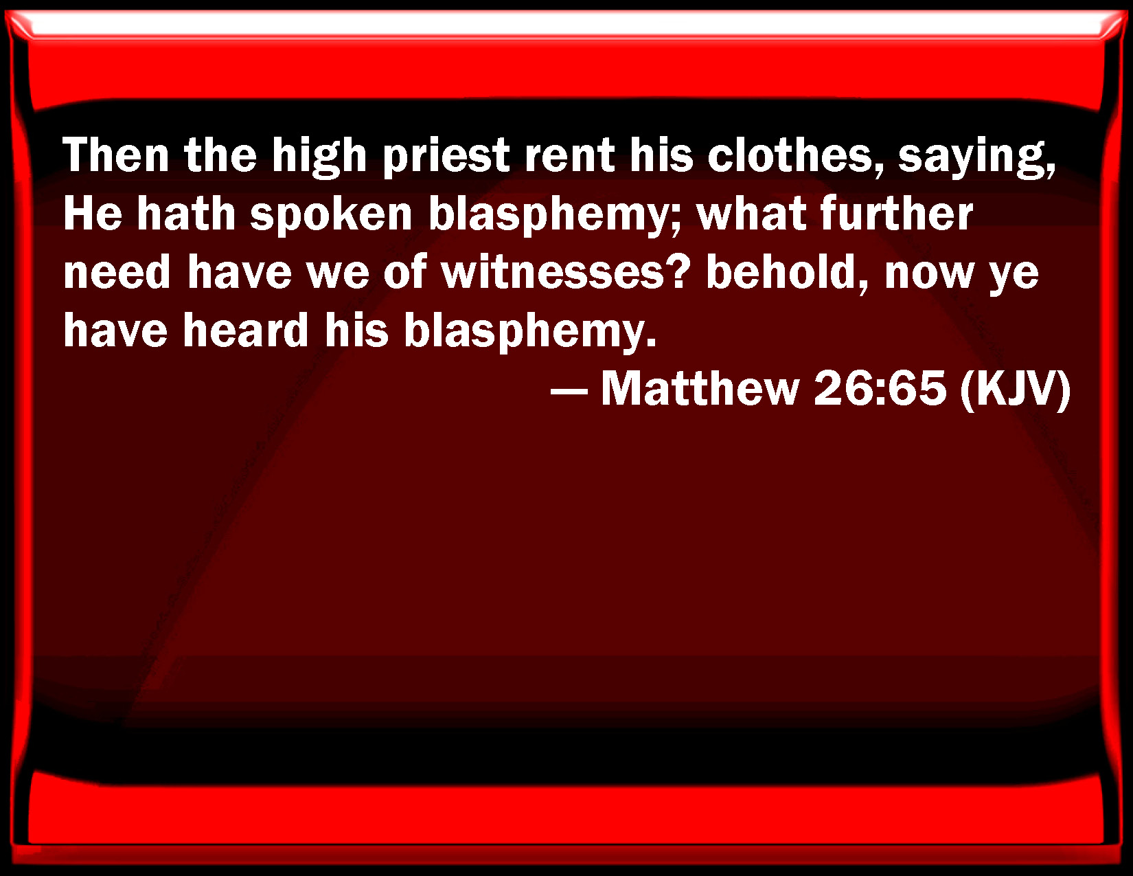 Bible Verse Slide Matthew 26:65 Then the high priest rent his clothes, saying, He has spoken blasphemy; what further need have we of witnesses? behold, now you have heard his blasphemy. KJV: Then the high priest rent his clothes, saying, He hath spoken blasphemy; what further need have we of witnesses? behold, now ye have heard his blasphemy. DRB: Then the high priests rent his garments, saying: He hath blasphemed; what further need have we of witnesses? Behold, now you have heard the blasphemy: DBT: Then the high priest rent his clothes, saying, He has blasphemed: what need have we any more of witnesses? behold, now ye have heard the blasphemy. ERV: Then the high priest rent his garments, saying, He hath spoken blasphemy: what further need have we of witnesses? behold, now ye have heard the blasphemy: WBT: Then the high priest rent his clothes, saying, He hath spoken blasphemy; what further need have we of witnesses? behold, now ye have heard his blasphemy. WEB: Then the high priest tore his clothing, saying, "He has spoken blasphemy! Why do we need any more witnesses? Behold, now you have heard his blasphemy. YLT: Then the chief priest rent his garments, saying, — 'He hath spoken evil; what need have we yet of witnesses? lo, now ye heard his evil speaking;Links Matthew 26:65 NIV • Matthew 26:65 NLT • Matthew 26:65 ESV • Matthew 26:65 NASB • Matthew 26:65 KJV • Matthew 26:65 Interlinear • Matthew 26:65 Commentaries • Matthew 26:65 Parallel Texts • Matthew 26:65 Bible Apps • Matthew 26:65 Parallel • Bible Hub |