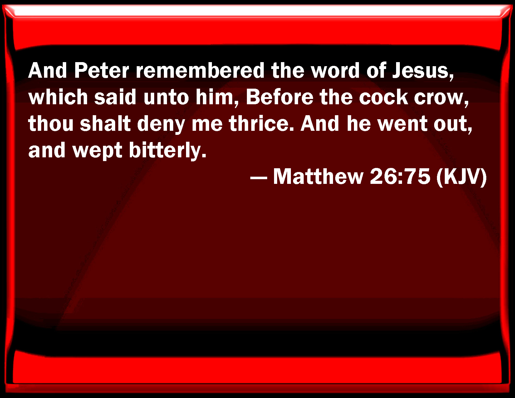Matthew 26:75 And Peter remembered the word of Jesus, which said to him, Before the cock crow, you shall deny me thrice. And he went out, and wept bitterly.