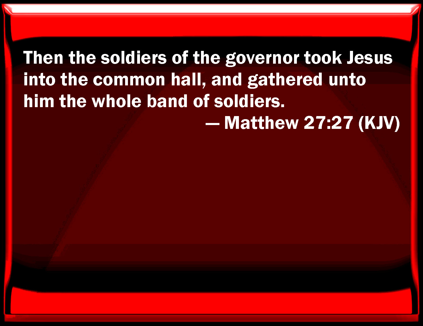 Bible Verse Slide Matthew 27:27 Then the soldiers of the governor took Jesus into the common hall, and gathered to him the whole band of soldiers. KJV: Then the soldiers of the governor took Jesus into the common hall, and gathered unto him the whole band of soldiers. DRB: Then the soldiers of the governor taking Jesus into the hall, gathered together unto him the whole band; DBT: Then the soldiers of the governor, having taken Jesus with them to the praetorium, gathered against him the whole band, ERV: Then the soldiers of the governor took Jesus into the palace, and gathered unto him the whole band. WBT: Then the soldiers of the governor took Jesus into the common hall, and gathered to him the whole band of soldiers. WEB: Then the governor's soldiers took Jesus into the Praetorium, and gathered the whole garrison together against him. YLT: then the soldiers of the governor having taken Jesus to the Praetorium, did gather to him all the band;Links Matthew 27:27 NIV • Matthew 27:27 NLT • Matthew 27:27 ESV • Matthew 27:27 NASB • Matthew 27:27 KJV • Matthew 27:27 Interlinear • Matthew 27:27 Commentaries • Matthew 27:27 Parallel Texts • Matthew 27:27 Bible Apps • Matthew 27:27 Parallel • Bible Hub |