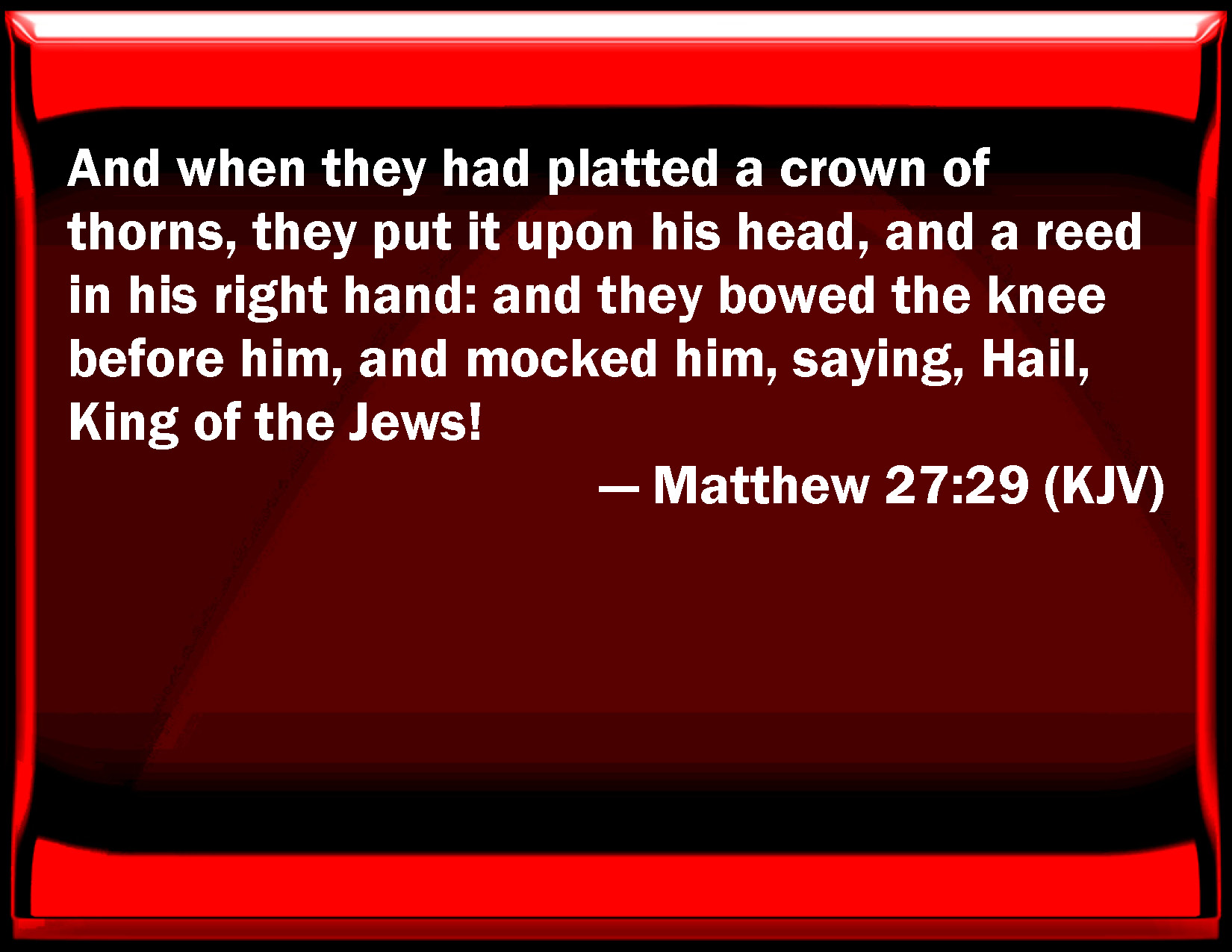 Bible Verse Slide Matthew 27:29 And when they had platted a crown of thorns, they put it on his head, and a reed in his right hand: and they bowed the knee before him, and mocked him, saying, Hail, King of the Jews! KJV: And when they had platted a crown of thorns, they put it upon his head, and a reed in his right hand: and they bowed the knee before him, and mocked him, saying, Hail, King of the Jews! DRB: And platting a crown of thorns, they put it upon his head, and a reed in his right hand. And bowing the knee before him, they mocked him, saying: Hail, king of the Jews. DBT: and having woven a crown out of thorns, they put it on his head, and a reed in his right hand; and, bowing the knee before him, they mocked him, saying, Hail, King of the Jews! ERV: And they plaited a crown of thorns and put it upon his head, and a reed in his right hand; and they kneeled down before him, and mocked him, saying, Hail, King of the Jews! WBT: And when they had platted a crown of thorns, they put it upon his head, and a reed in his right hand: and they bowed the knee before him, and mocked him, saying, Hail, King of the Jews? WEB: They braided a crown of thorns and put it on his head, and a reed in his right hand; and they kneeled down before him, and mocked him, saying, "Hail, King of the Jews!" YLT: and having plaited him a crown out of thorns they put it on his head, and a reed in his right hand, and having kneeled before him, they were mocking him, saying, 'Hail, the king of the Jews.'Links Matthew 27:29 NIV • Matthew 27:29 NLT • Matthew 27:29 ESV • Matthew 27:29 NASB • Matthew 27:29 KJV • Matthew 27:29 Interlinear • Matthew 27:29 Commentaries • Matthew 27:29 Parallel Texts • Matthew 27:29 Bible Apps • Matthew 27:29 Parallel • Bible Hub |