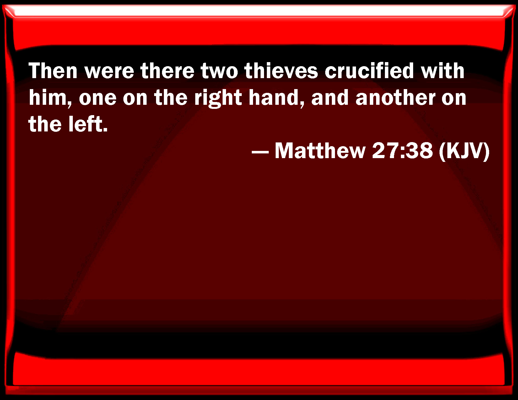 Bible Verse Slide Matthew 27:38 Then were there two thieves crucified with him, one on the right hand, and another on the left. KJV: Then were there two thieves crucified with him, one on the right hand, and another on the left. DRB: Then were crucified with him two thieves: one on the right hand, and one on the left. DBT: Then are crucified with him two robbers, one on the right hand and one on the left. ERV: Then are there crucified with him two robbers, one on the right hand, and one on the left. WBT: Then were there two thieves crucified with him: one on the right hand, and another on the left. WEB: Then there were two robbers crucified with him, one on his right hand and one on the left. YLT: Then crucified with him are two robbers, one on the right hand, and one on the left,Links Matthew 27:38 NIV • Matthew 27:38 NLT • Matthew 27:38 ESV • Matthew 27:38 NASB • Matthew 27:38 KJV • Matthew 27:38 Interlinear • Matthew 27:38 Commentaries • Matthew 27:38 Parallel Texts • Matthew 27:38 Bible Apps • Matthew 27:38 Parallel • Bible Hub |
