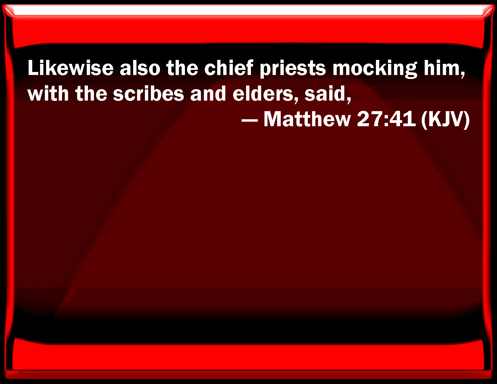 Bible Verse Slide Matthew 27:41 Likewise also the chief priests mocking him, with the scribes and elders, said, KJV: Likewise also the chief priests mocking him, with the scribes and elders, said, DRB: In like manner also the chief priests, with the scribes and ancients, mocking, said: DBT: And in like manner the chief priests also, mocking, with the scribes and elders, said, ERV: In like manner also the chief priests mocking him, with the scribes and elders, said, WBT: Likewise also the chief priests mocking him, with the scribes and elders, said, WEB: Likewise the chief priests also mocking, with the scribes, the Pharisees, and the elders, said, YLT: And in like manner also the chief priests mocking, with the scribes and elders, said,Links Matthew 27:41 NIV • Matthew 27:41 NLT • Matthew 27:41 ESV • Matthew 27:41 NASB • Matthew 27:41 KJV • Matthew 27:41 Interlinear • Matthew 27:41 Commentaries • Matthew 27:41 Parallel Texts • Matthew 27:41 Bible Apps • Matthew 27:41 Parallel • Bible Hub |