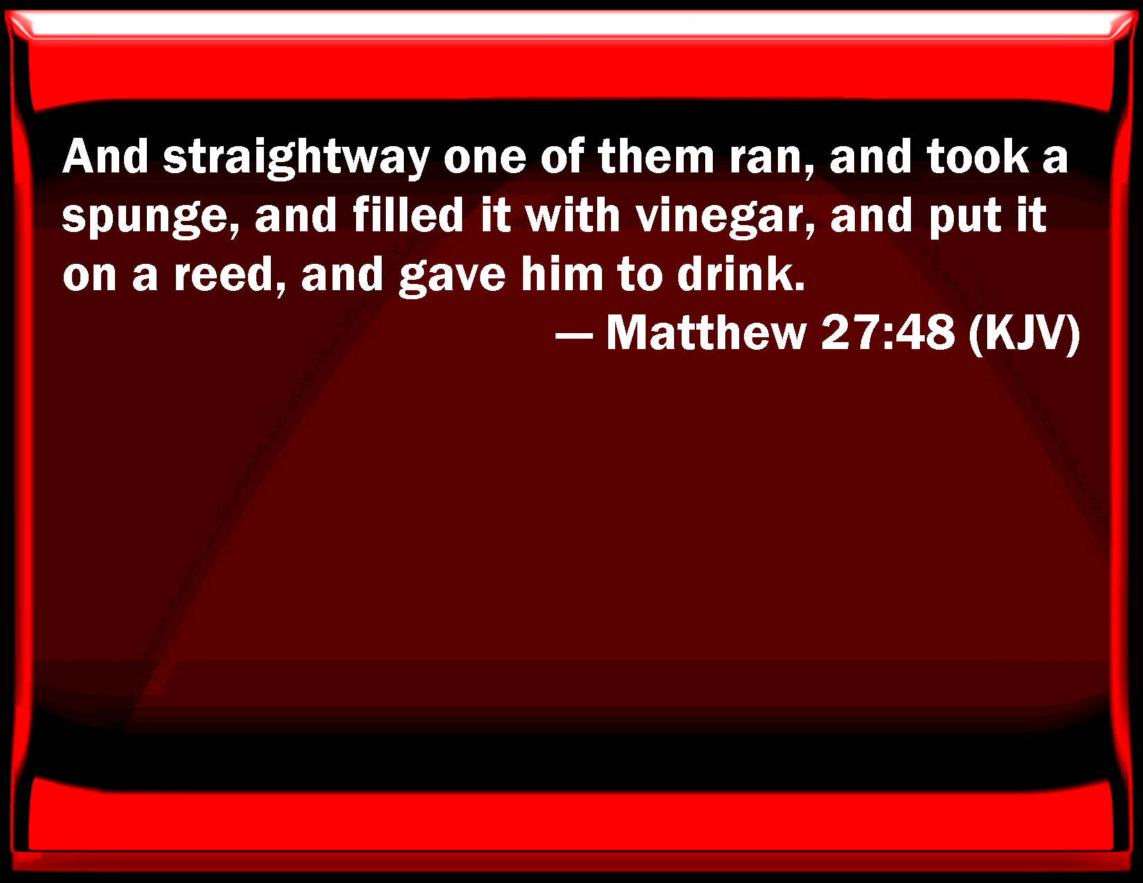 Bible Verse Slide Matthew 27:48 And straightway one of them ran, and took a sponge, and filled it with vinegar, and put it on a reed, and gave him to drink. KJV: And straightway one of them ran, and took a spunge, and filled it with vinegar, and put it on a reed, and gave him to drink. DRB: And immediately one of them running took a sponge, and filled it with vinegar; and put it on a reed, and gave him to drink. DBT: And immediately one of them running and getting a sponge, having filled it with vinegar and fixed it on a reed, gave him to drink. ERV: And straightway one of them ran, and took a sponge, and filled it with vinegar, and put it on a reed, and gave him to drink. WBT: And immediately one of them ran, and took a spunge, and filled it with vinegar, and put it on a reed, and gave him to drink. WEB: Immediately one of them ran, and took a sponge, and filled it with vinegar, and put it on a reed, and gave him a drink. YLT: and immediately, one of them having run, and having taken a spunge, having filled it with vinegar, and having put it on a reed, was giving him to drink,Links Matthew 27:48 NIV • Matthew 27:48 NLT • Matthew 27:48 ESV • Matthew 27:48 NASB • Matthew 27:48 KJV • Matthew 27:48 Interlinear • Matthew 27:48 Commentaries • Matthew 27:48 Parallel Texts • Matthew 27:48 Bible Apps • Matthew 27:48 Parallel • Bible Hub |