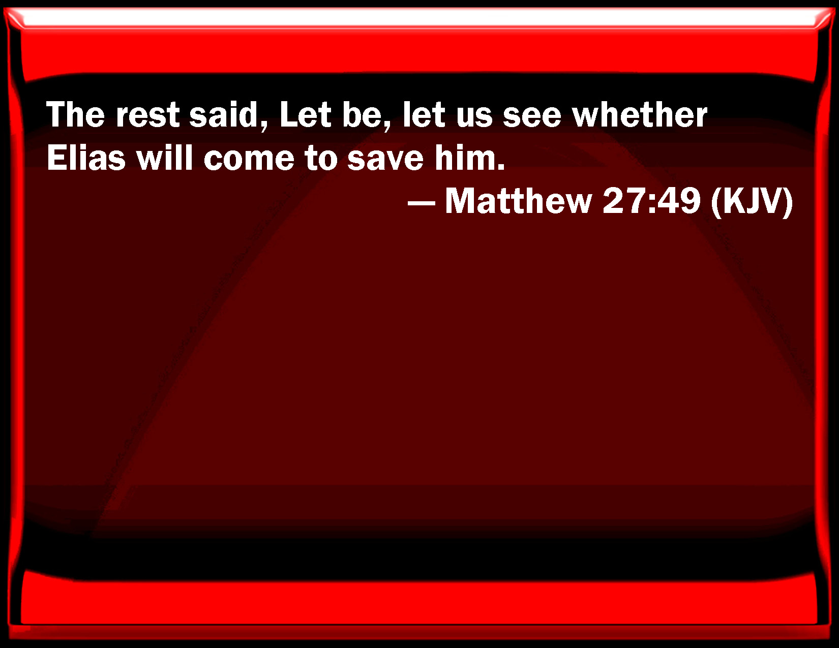 Bible Verse Slide Matthew 27:49 The rest said, Let be, let us see whether Elias will come to save him. KJV: The rest said, Let be, let us see whether Elias will come to save him. DRB: And the others said: Let be, let us see whether Elias will come to deliver him. DBT: But the rest said, Let be; let us see if Elias comes to save him. ERV: And the rest said, Let be; let us see whether Elijah cometh to save him. WBT: The rest said, Forbear, let us see whether Elijah will come to save him. WEB: The rest said, "Let him be. Let's see whether Elijah comes to save him." YLT: but the rest said, 'Let alone, let us see if Elijah doth come — about to save him.'Links Matthew 27:49 NIV • Matthew 27:49 NLT • Matthew 27:49 ESV • Matthew 27:49 NASB • Matthew 27:49 KJV • Matthew 27:49 Interlinear • Matthew 27:49 Commentaries • Matthew 27:49 Parallel Texts • Matthew 27:49 Bible Apps • Matthew 27:49 Parallel • Bible Hub |