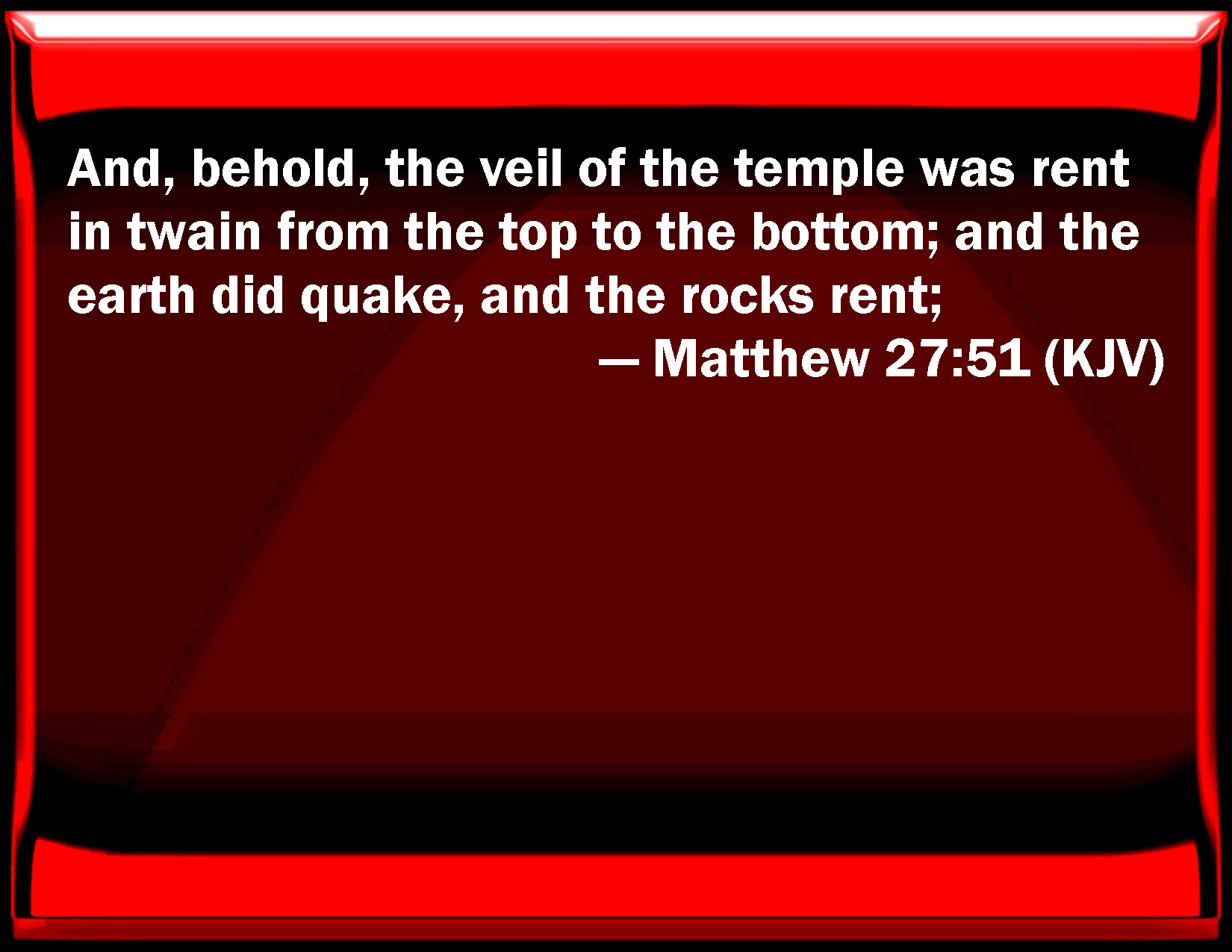 Bible Verse Slide Matthew 27:51 And, behold, the veil of the temple was rent in two from the top to the bottom; and the earth did quake, and the rocks rent; KJV: And, behold, the veil of the temple was rent in twain from the top to the bottom; and the earth did quake, and the rocks rent; DRB: And behold the veil of the temple was rent in two from the top even to the bottom, and the earth quaked, and the rocks were rent. DBT: And lo, the veil of the temple was rent in two from the top to the bottom, and the earth was shaken, and the rocks were rent, ERV: And behold, the veil of the temple was rent in twain from the top to the bottom; and the earth did quake; and the rocks were rent; WBT: And behold, the vail of the temple was rent in two, from the top to the bottom: and the earth shook, and the rocks rent; WEB: Behold, the veil of the temple was torn in two from the top to the bottom. The earth quaked and the rocks were split. YLT: and lo, the vail of the sanctuary was rent in two from top unto bottom, and the earth did quake, and the rocks were rent,Links Matthew 27:51 NIV • Matthew 27:51 NLT • Matthew 27:51 ESV • Matthew 27:51 NASB • Matthew 27:51 KJV • Matthew 27:51 Interlinear • Matthew 27:51 Commentaries • Matthew 27:51 Parallel Texts • Matthew 27:51 Bible Apps • Matthew 27:51 Parallel • Bible Hub |