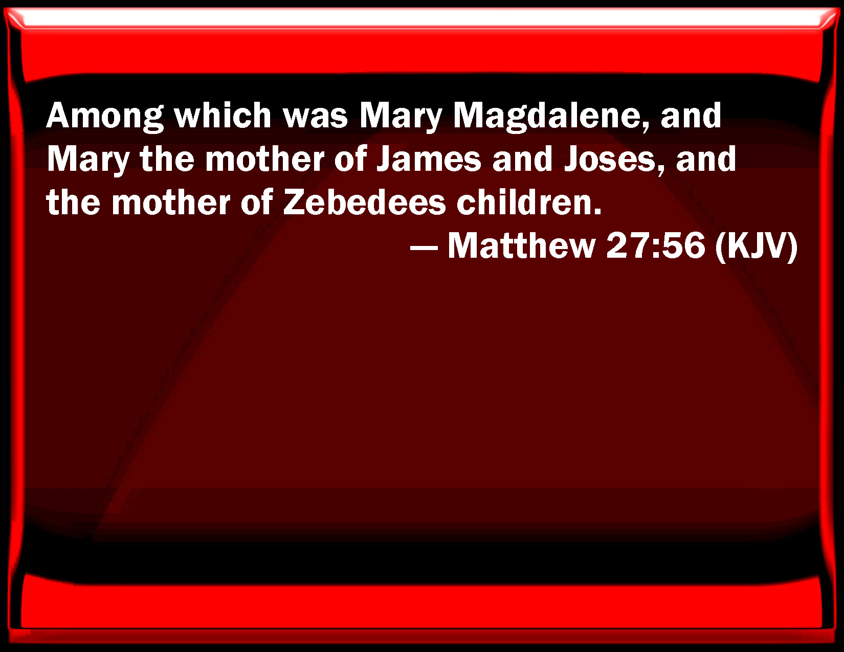 Bible Verse Slide Matthew 27:56 Among which was Mary Magdalene, and Mary the mother of James and Joses, and the mother of Zebedees children. KJV: Among which was Mary Magdalene, and Mary the mother of James and Joses, and the mother of Zebedee's children. DRB: Among whom was Mary Magdalen, and Mary the mother of James and Joseph, and the mother of the sons of Zebedee. DBT: among whom was Mary of Magdala, and Mary the mother of James and Joses, and the mother of the sons of Zebedee. ERV: among whom was Mary Magdalene, and Mary the mother of James and Joses, and the mother of the sons of Zebedee. WBT: Among whom was Mary Magdalene, and Mary the mother of James and Joses, and the mother of Zebedee's children. WEB: Among them were Mary Magdalene, Mary the mother of James and Joses, and the mother of the sons of Zebedee. YLT: among whom was Mary the Magdalene, and Mary the mother of James and of Joses, and the mother of the sons of Zebedee.Links Matthew 27:56 NIV • Matthew 27:56 NLT • Matthew 27:56 ESV • Matthew 27:56 NASB • Matthew 27:56 KJV • Matthew 27:56 Interlinear • Matthew 27:56 Commentaries • Matthew 27:56 Parallel Texts • Matthew 27:56 Bible Apps • Matthew 27:56 Parallel • Bible Hub |